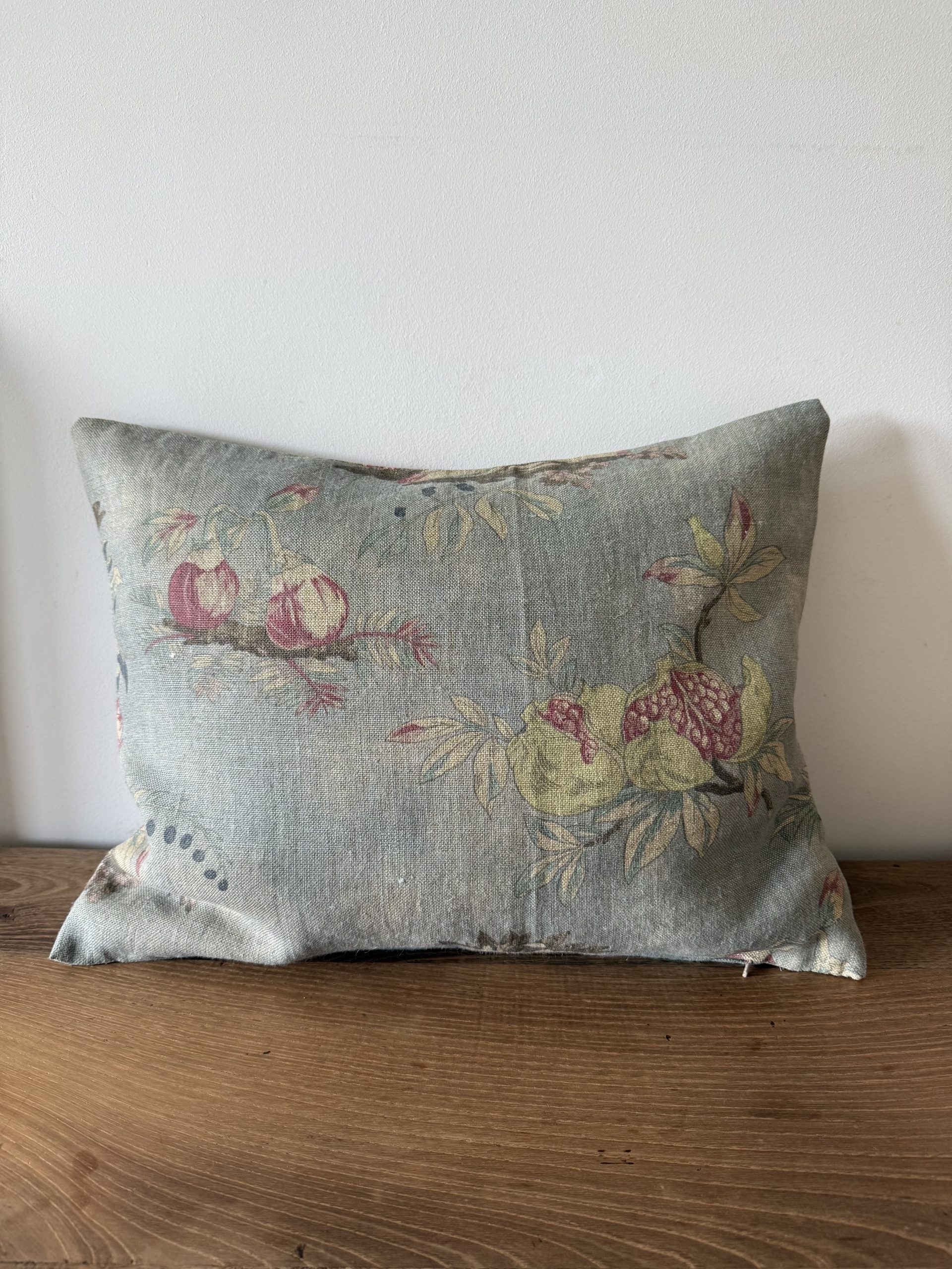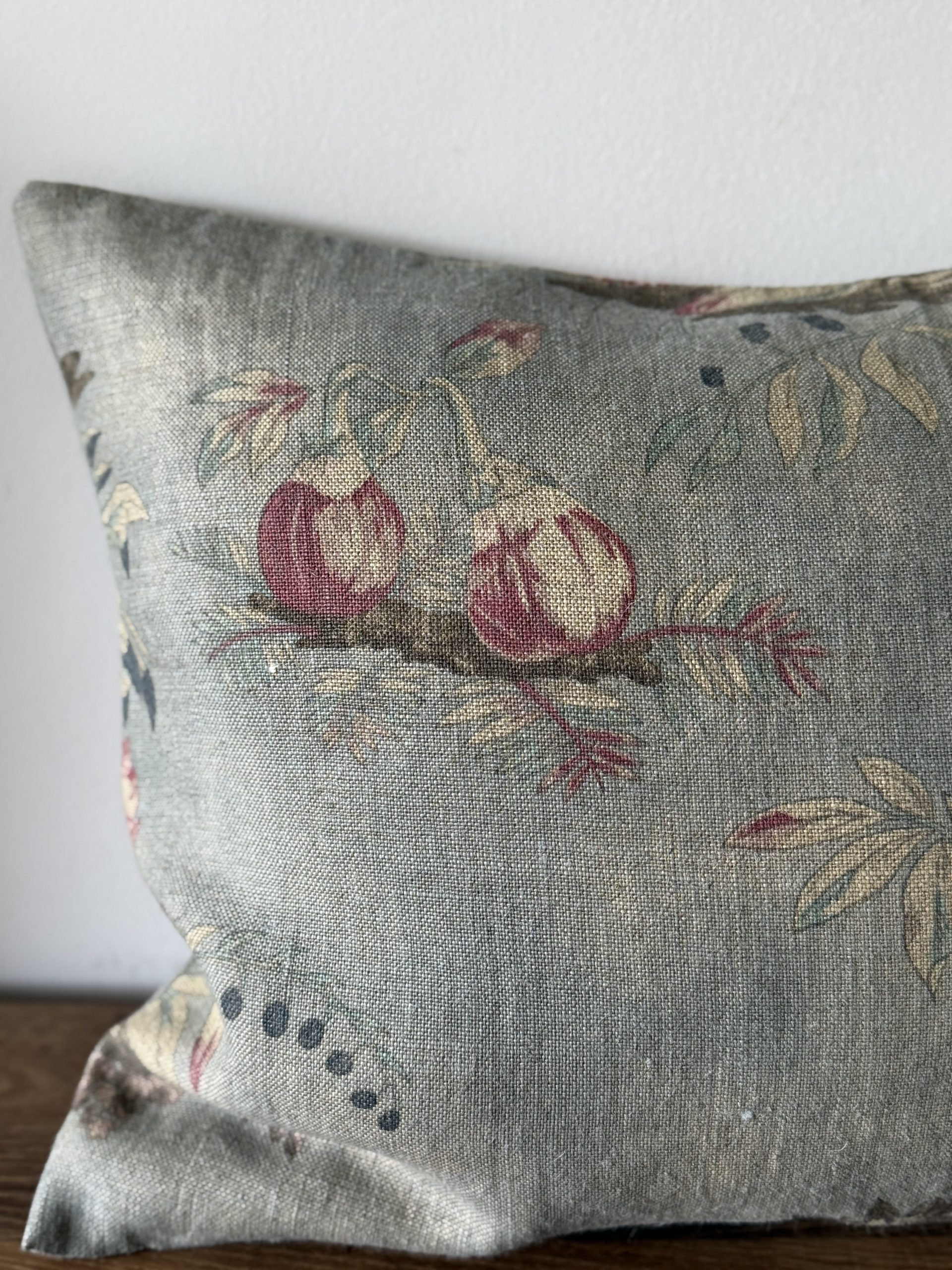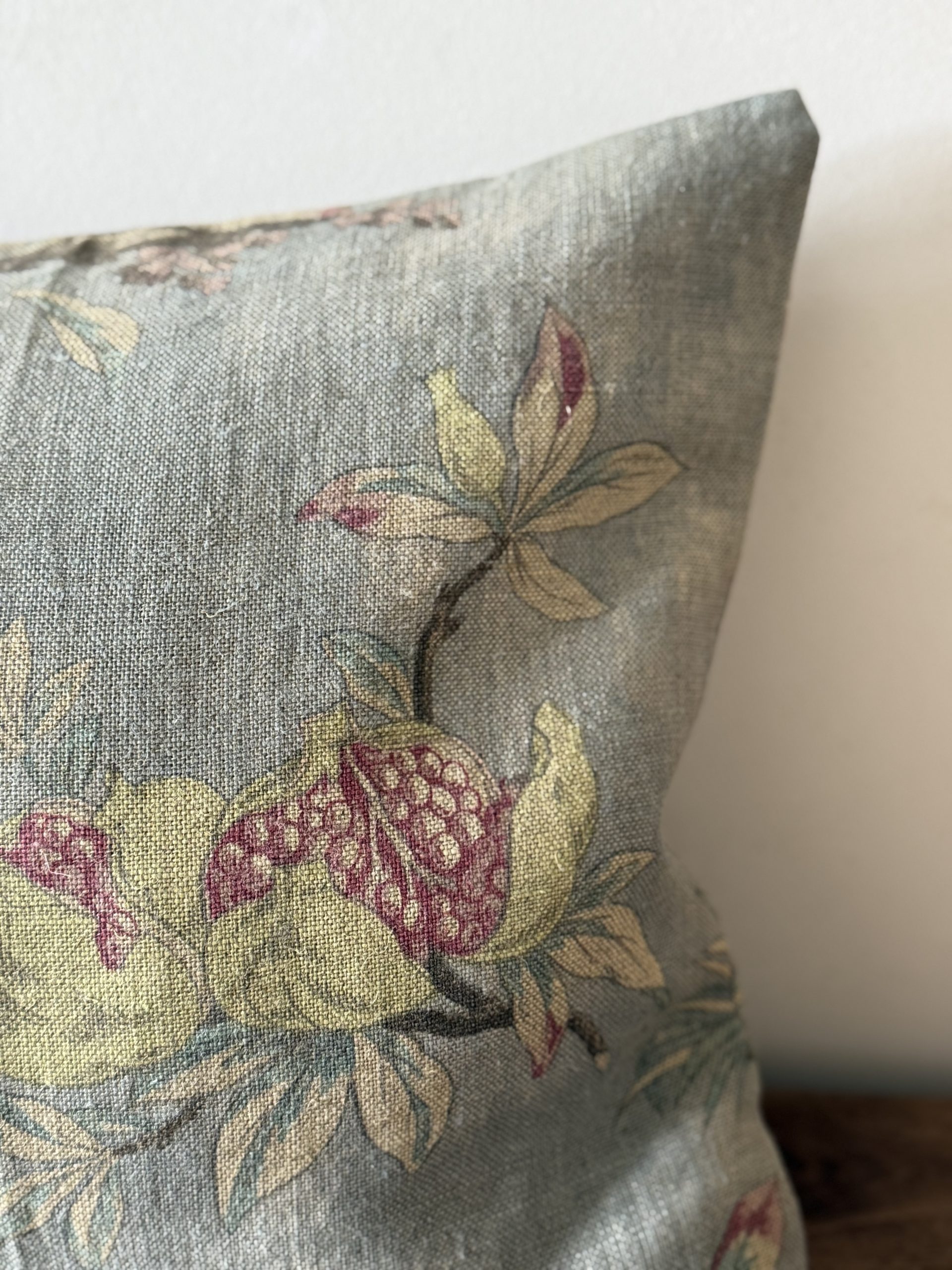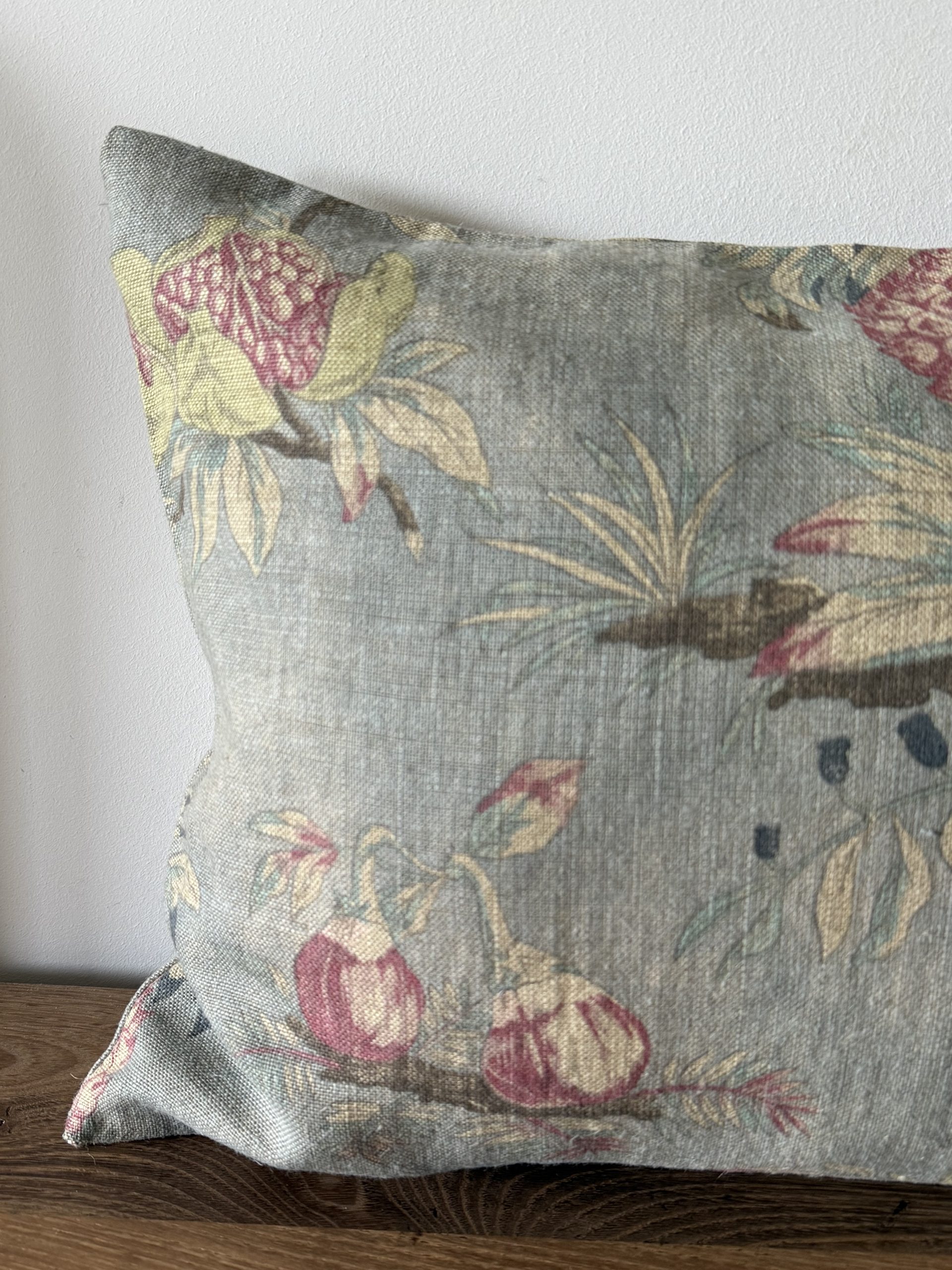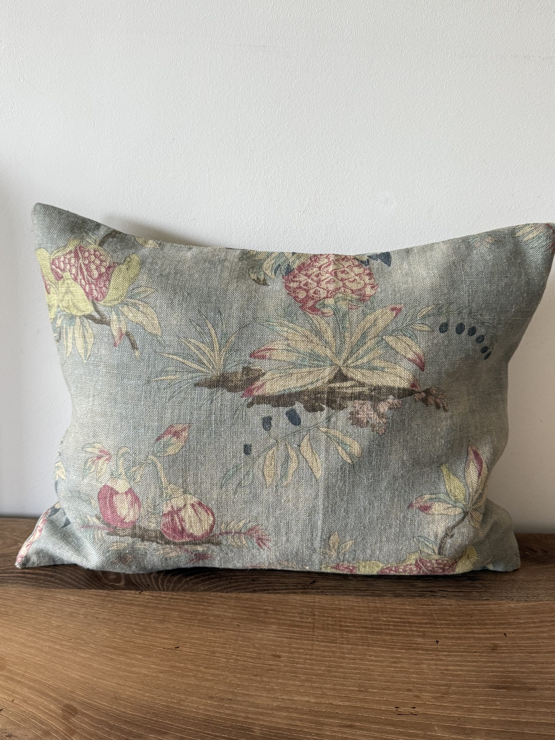 Almohadón de estampado floral con fondo azul. Tejido lino 100%.