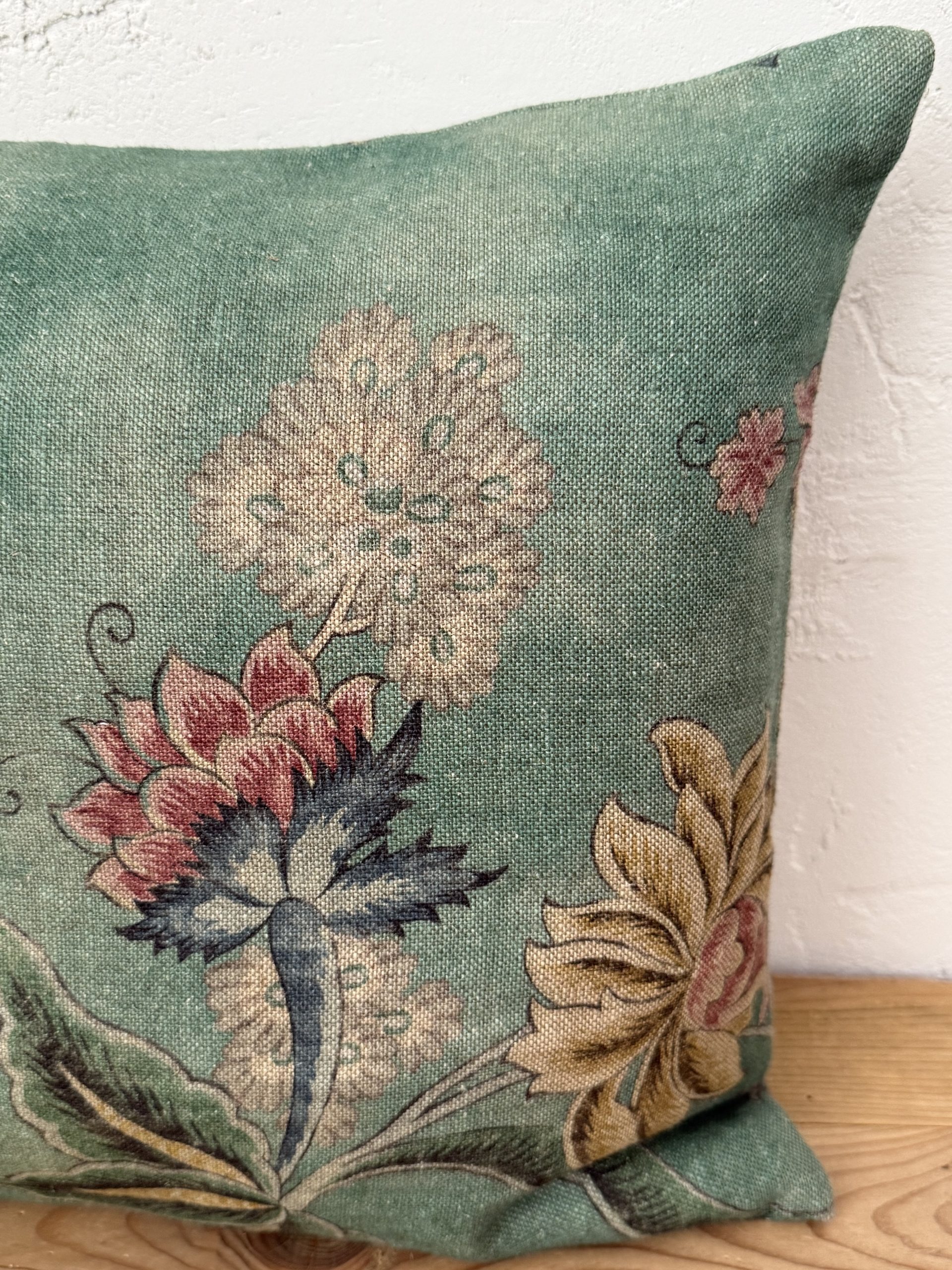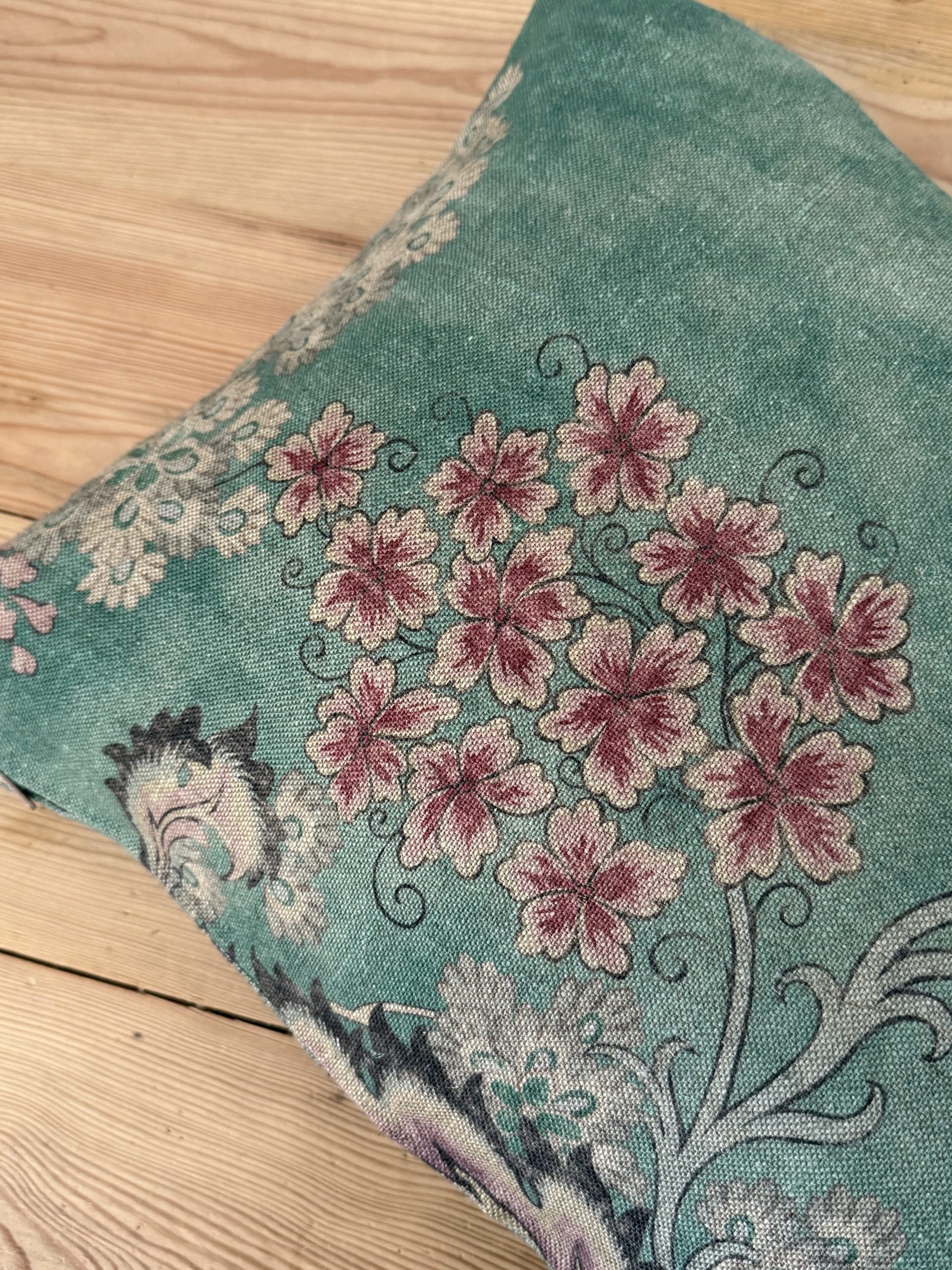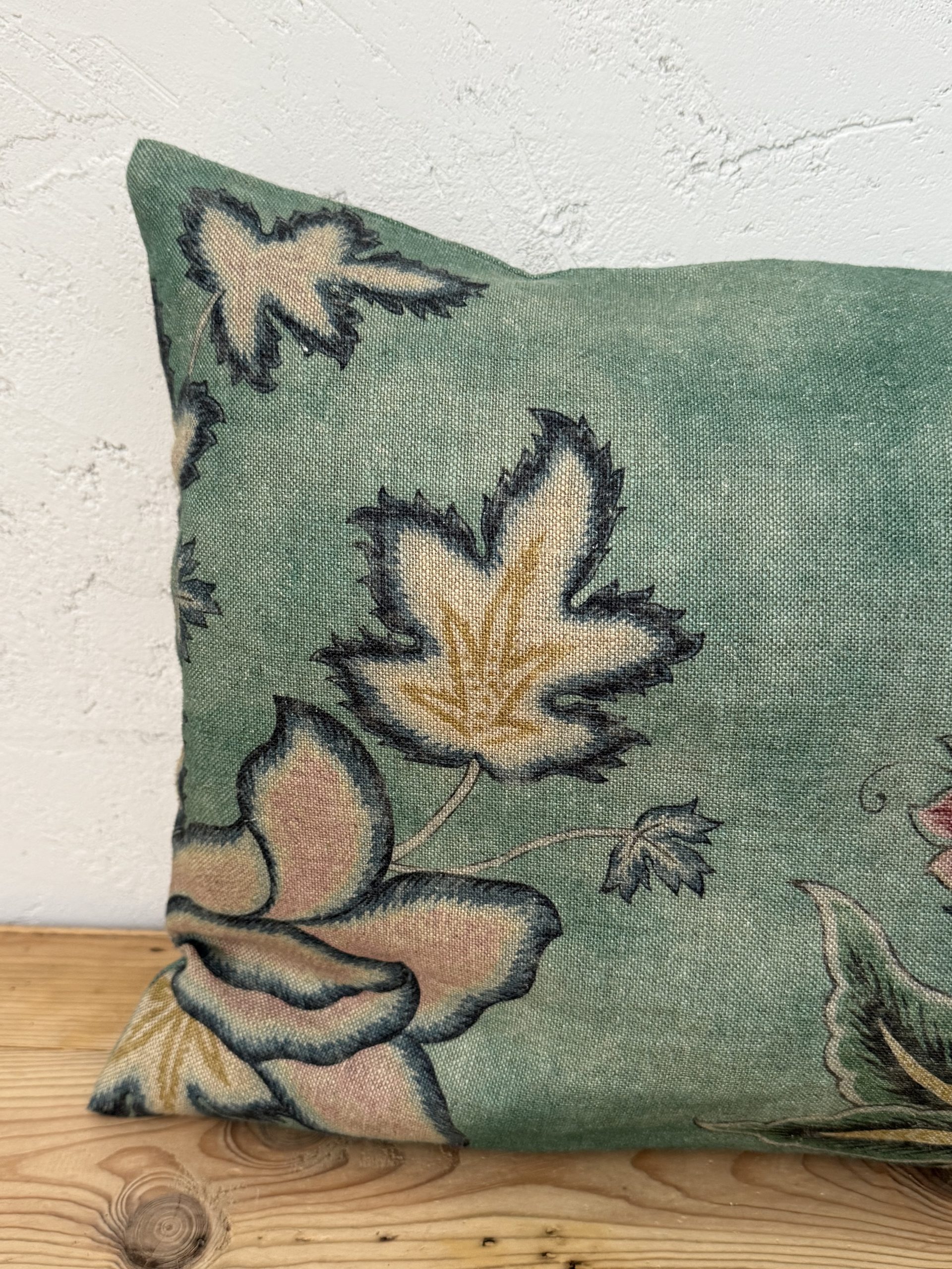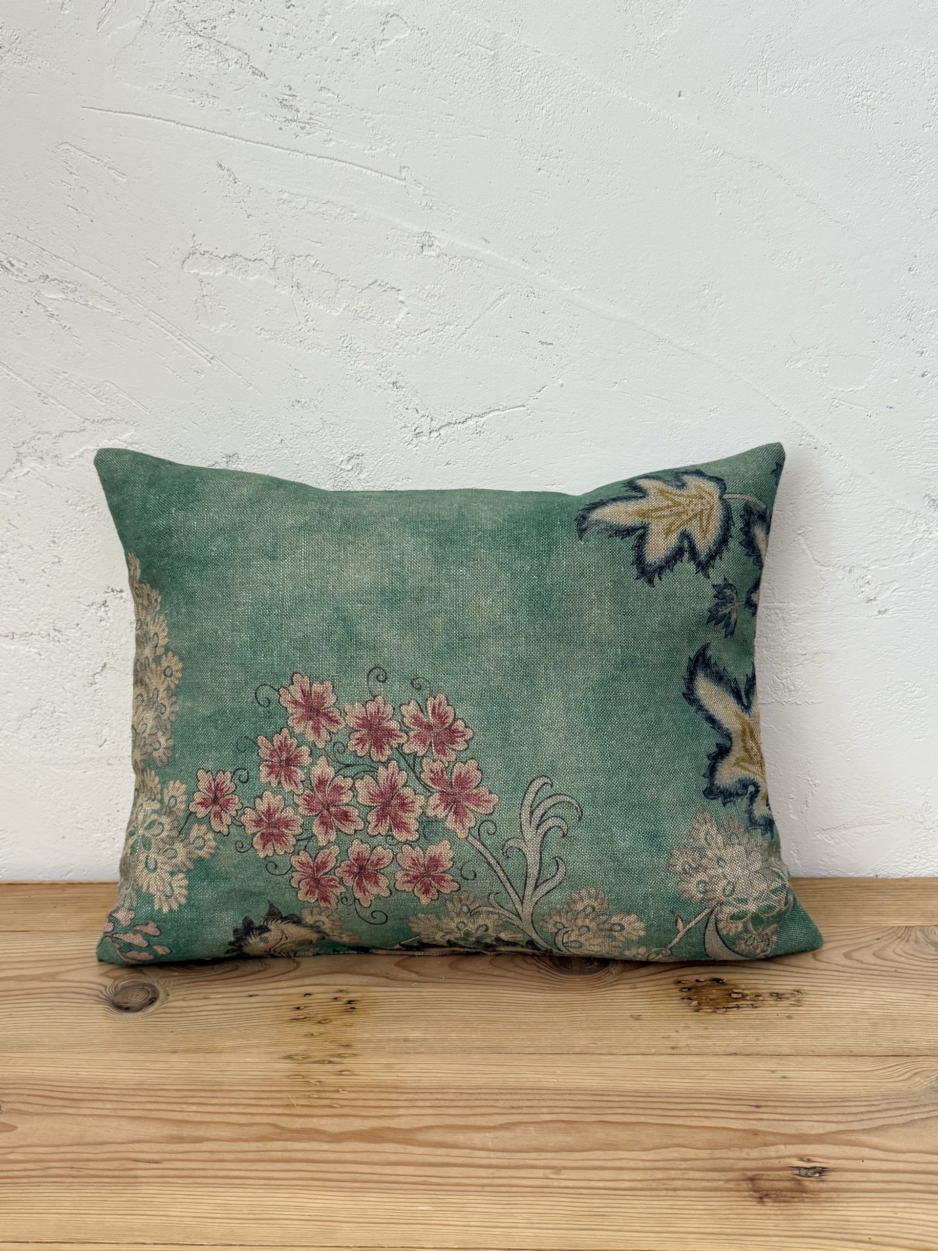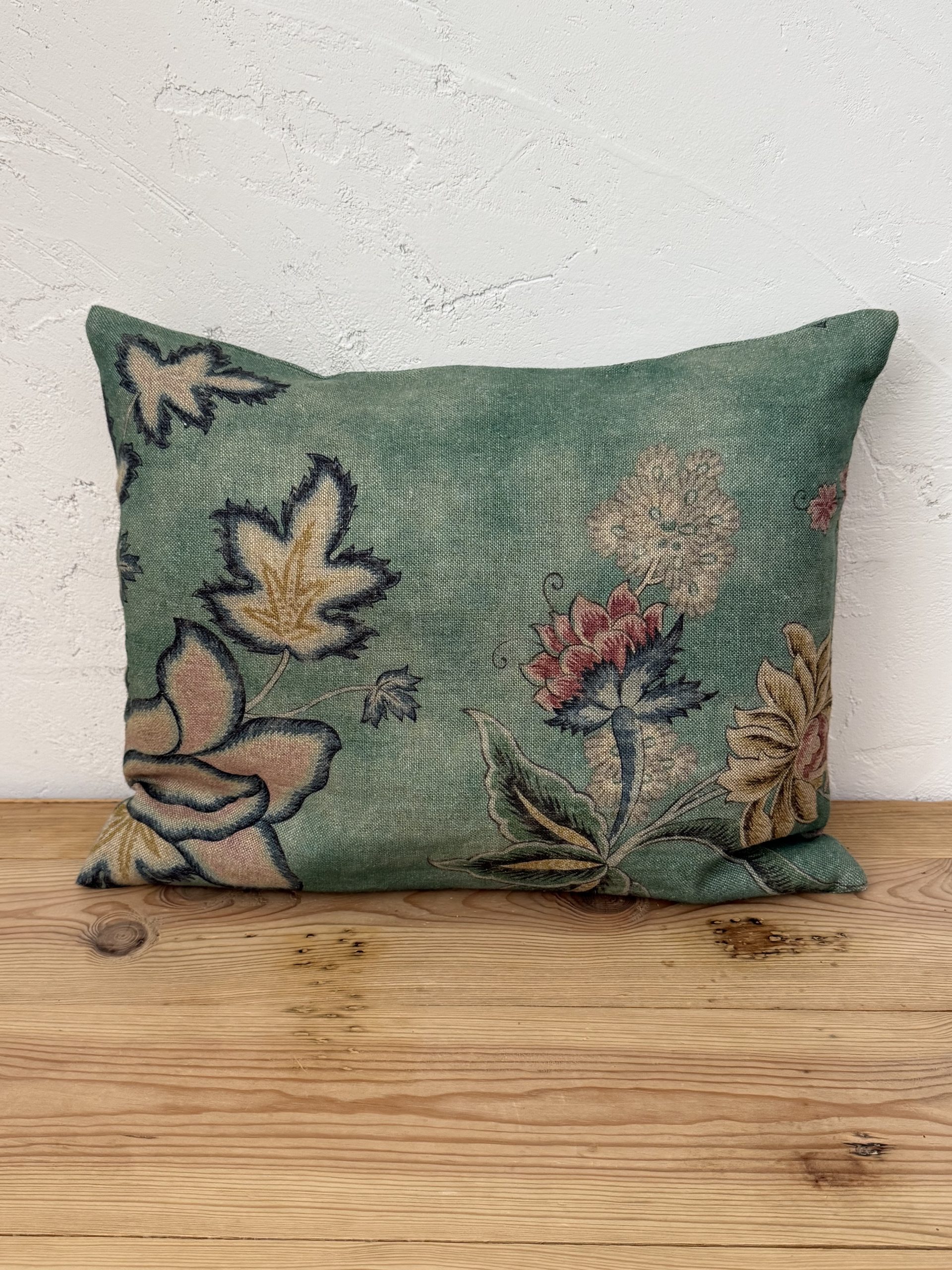 Almohadón estampado en tonos verdes con motivos florales que evocan un verdadero sueño.