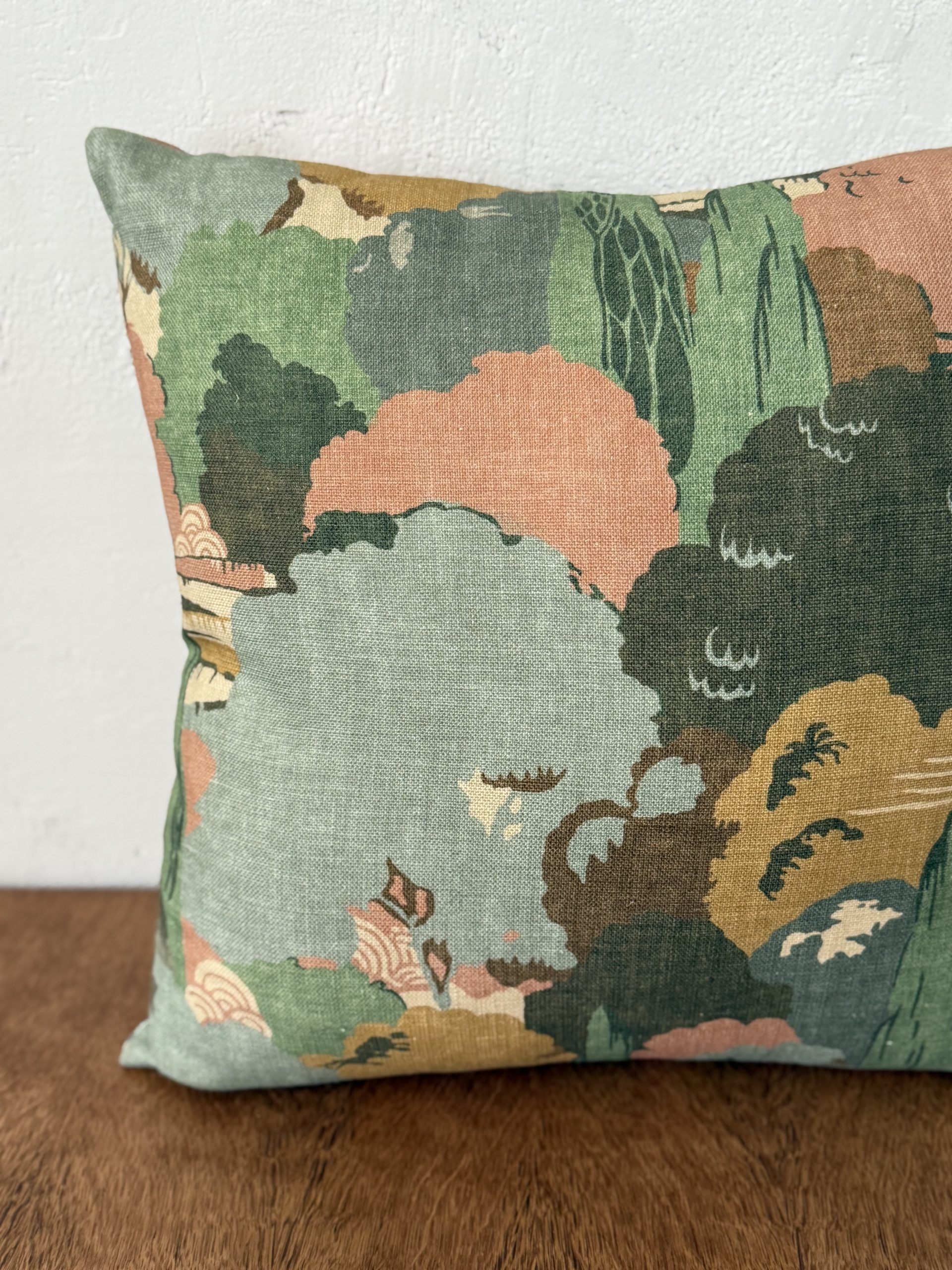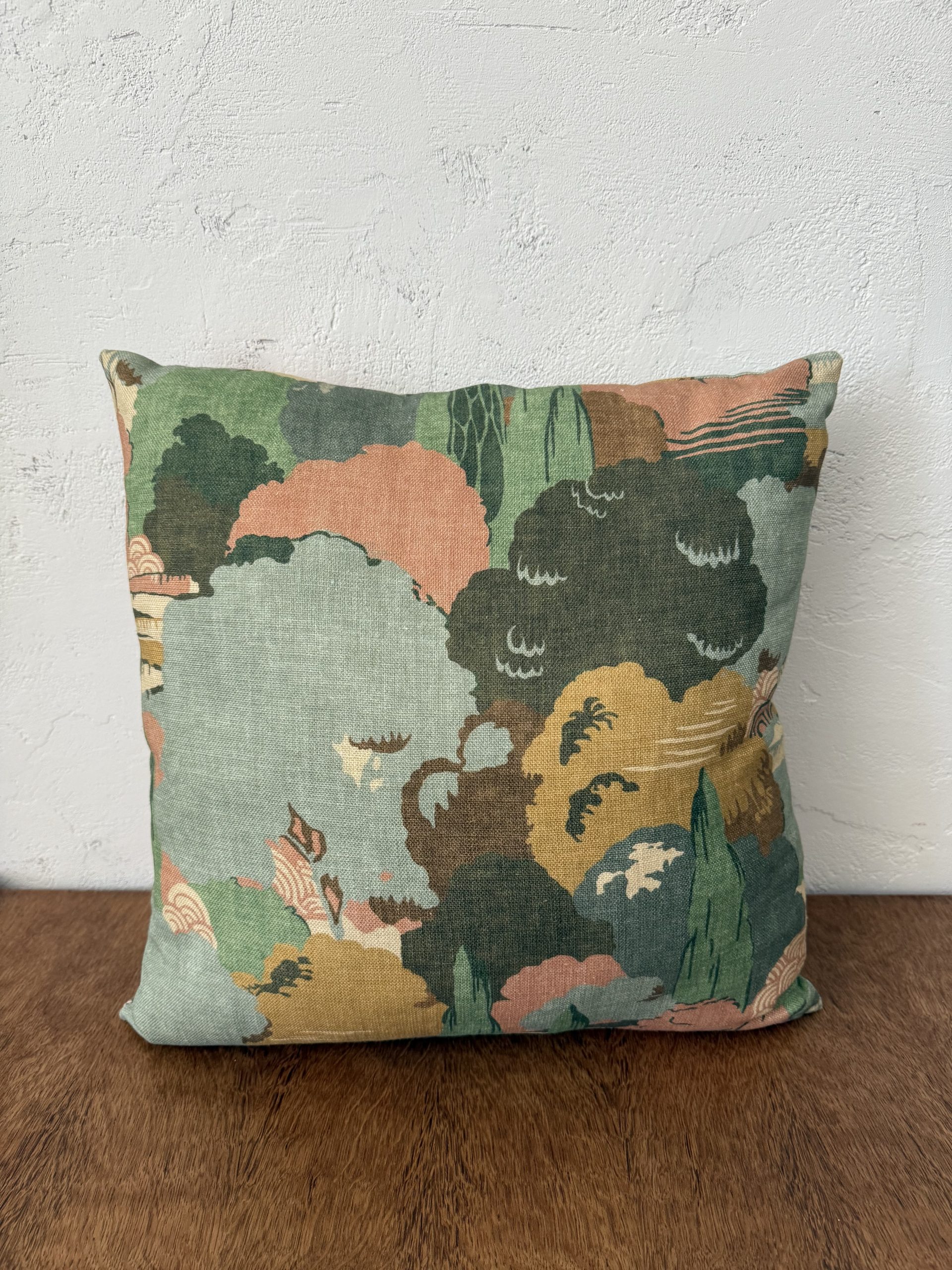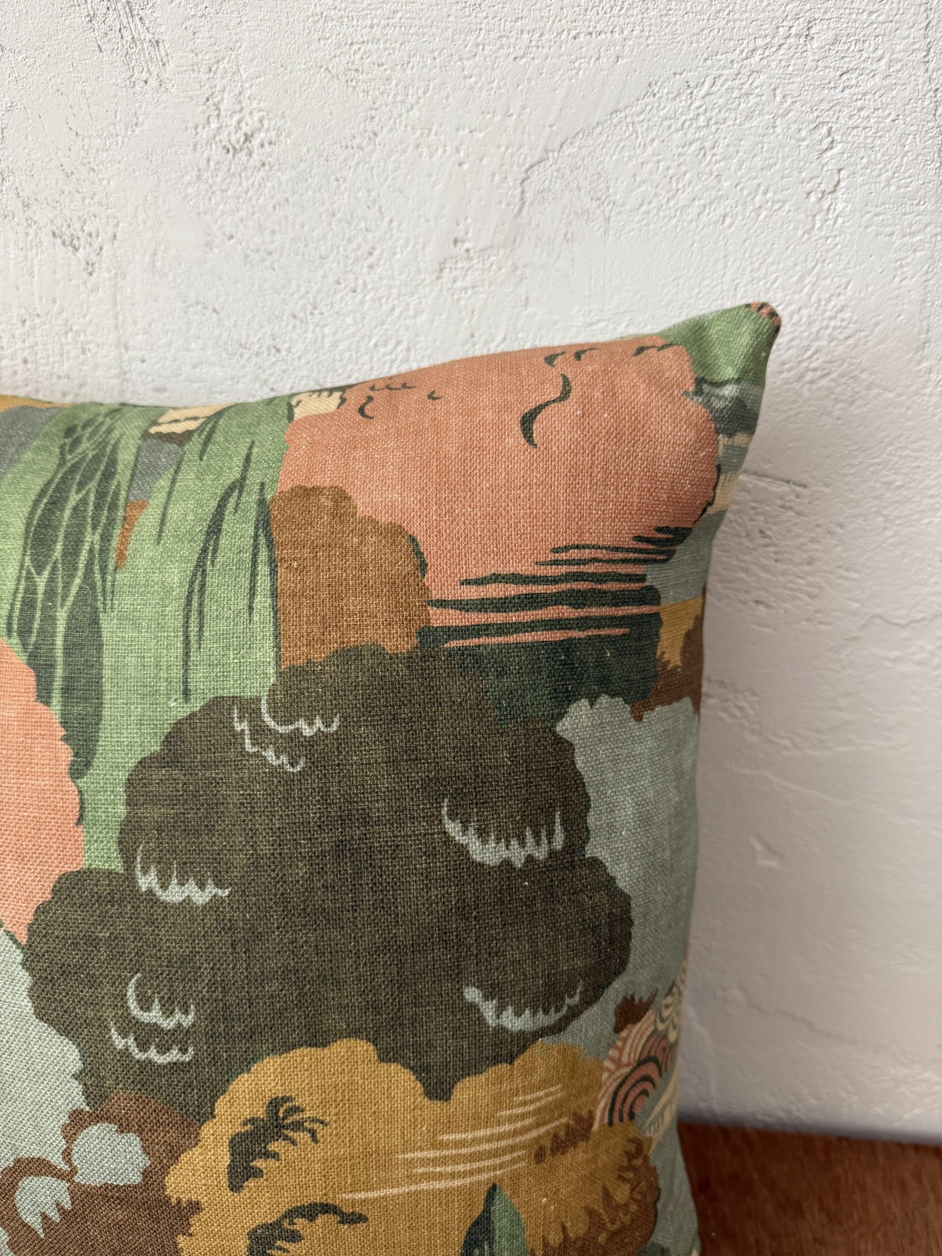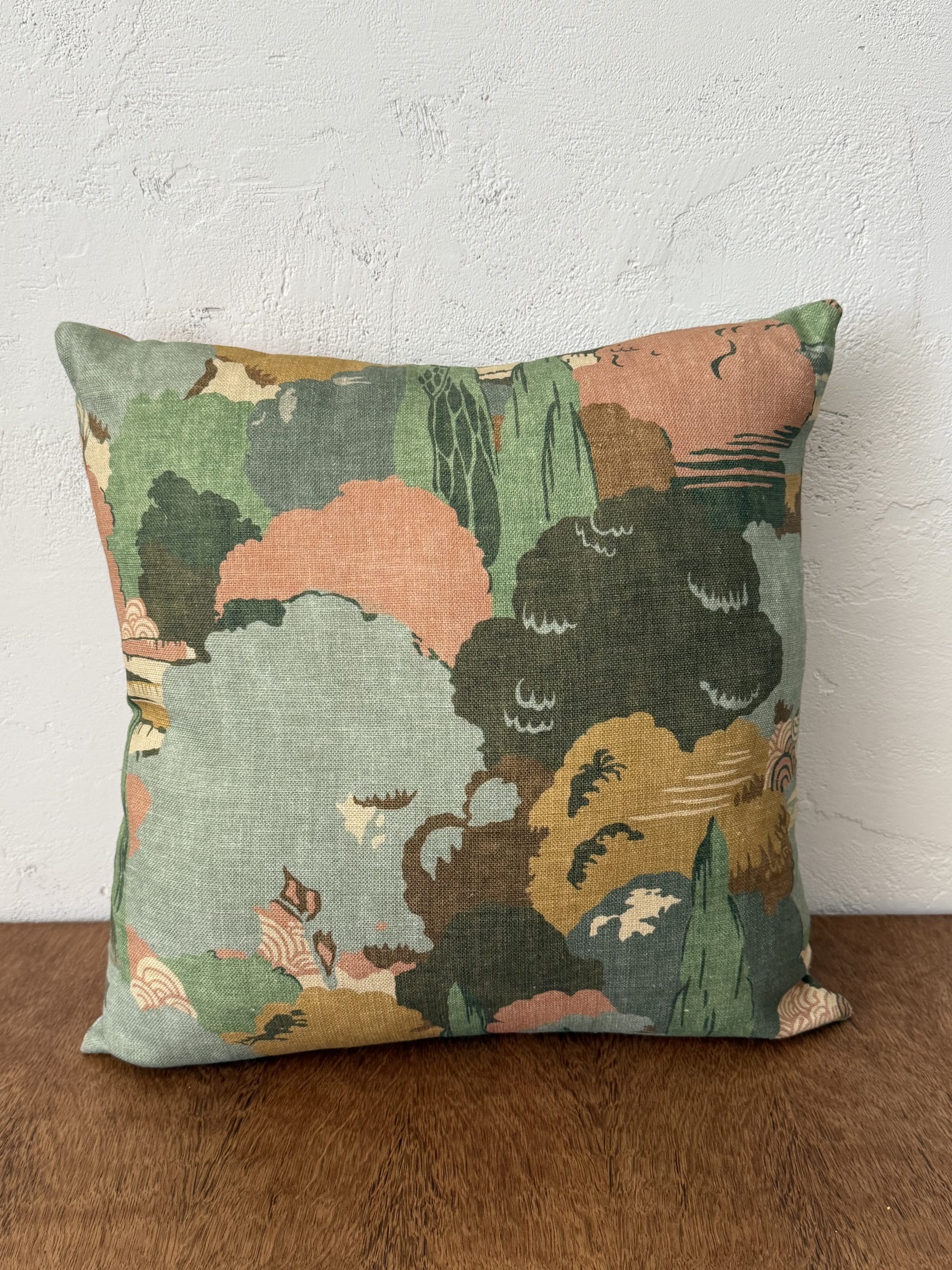 Almohadón confeccionado con una tela que evoca un paisaje de bosque con una mezcla de varios colores muy atractivos.
