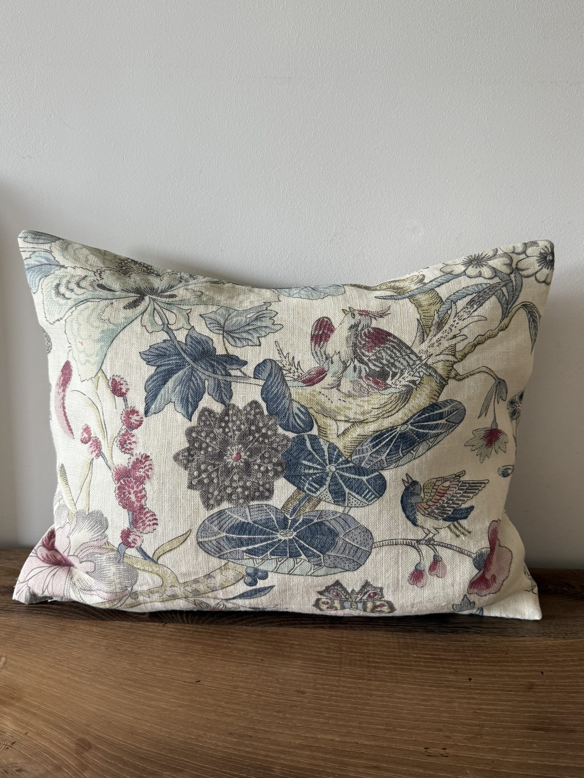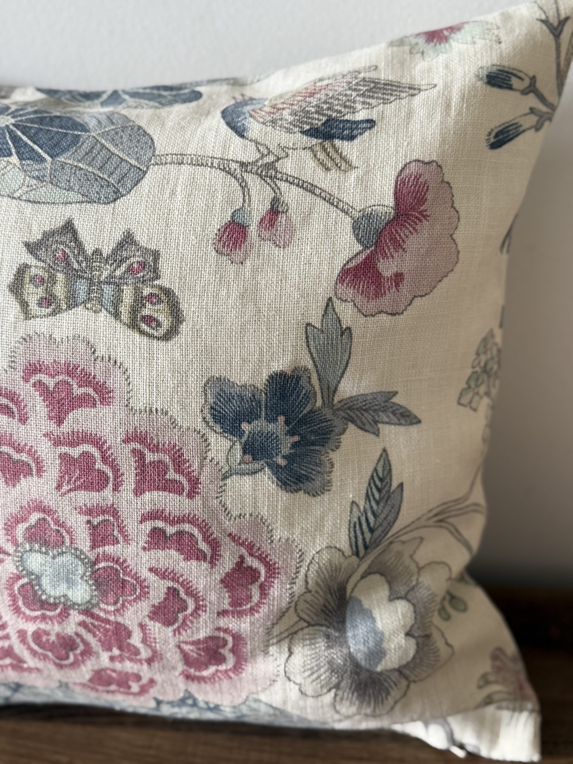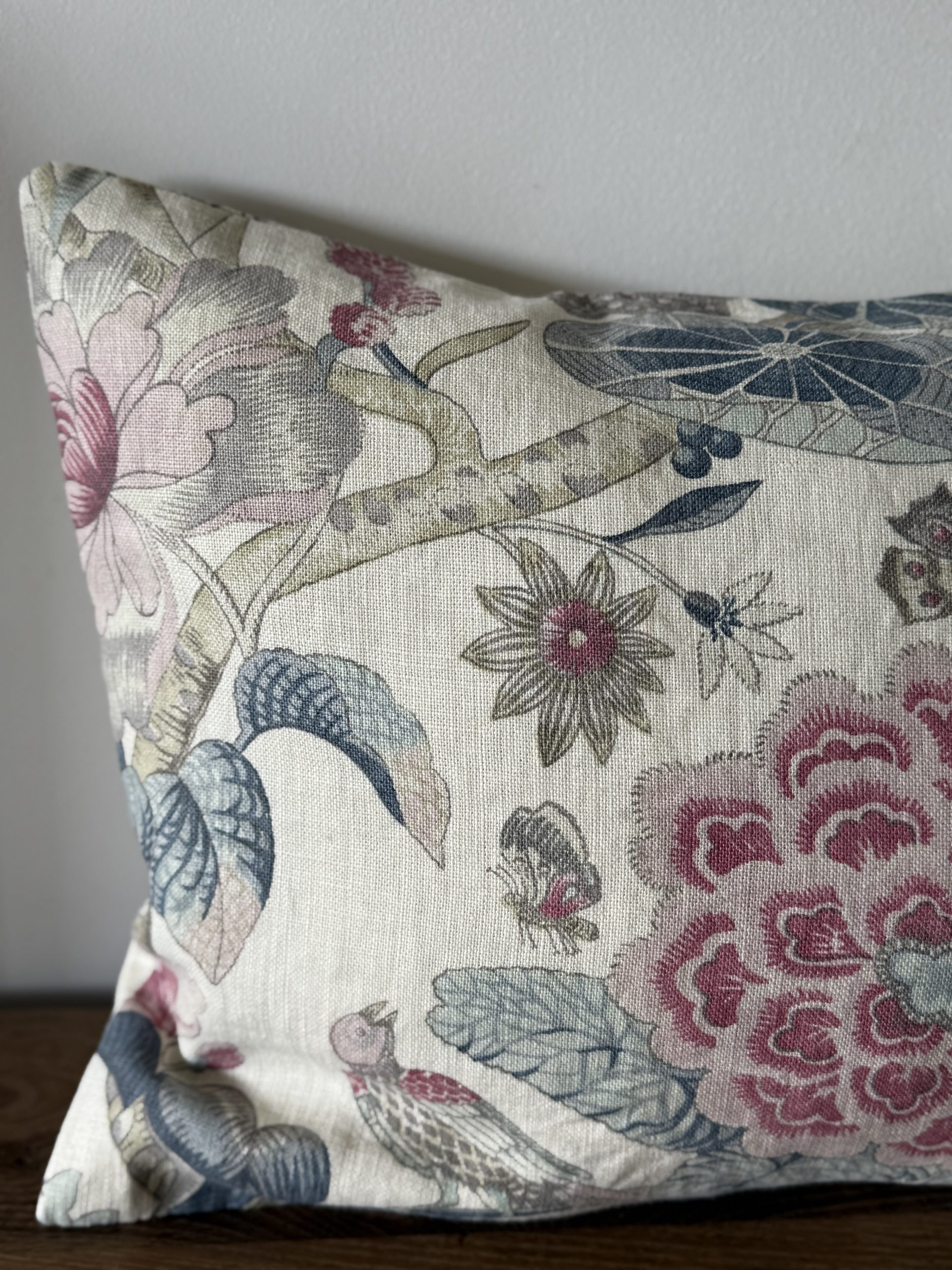 Almohadón de estampado floral con fondo blanco. Tejido lino 100%.