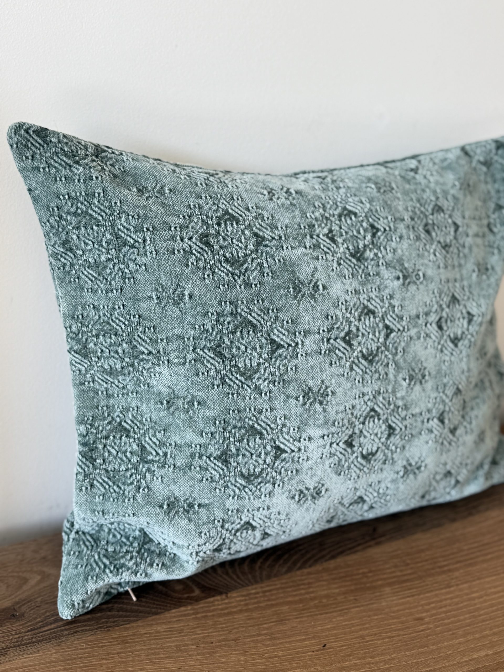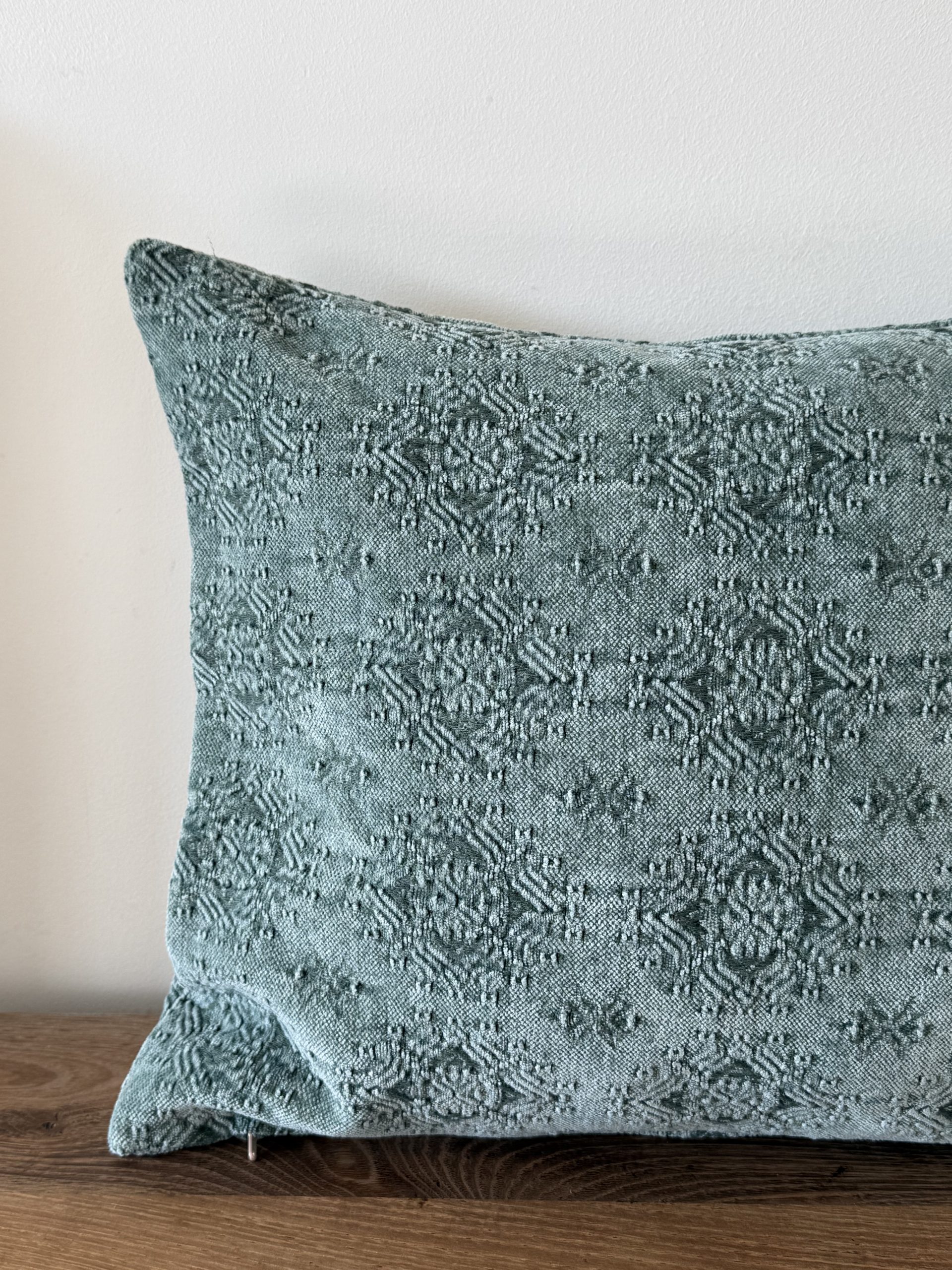Exquisito tejido con relieve y color azul verdoso.