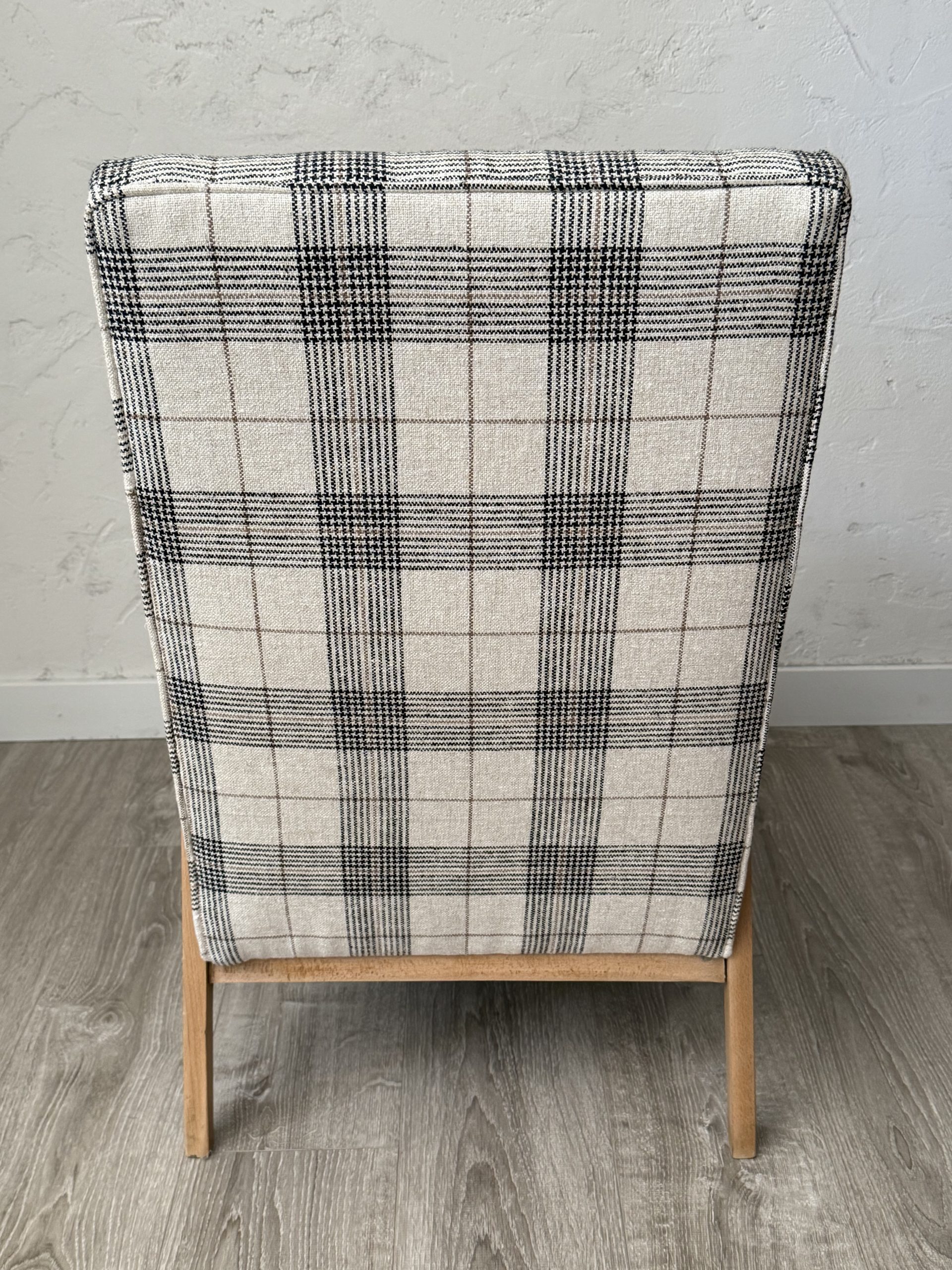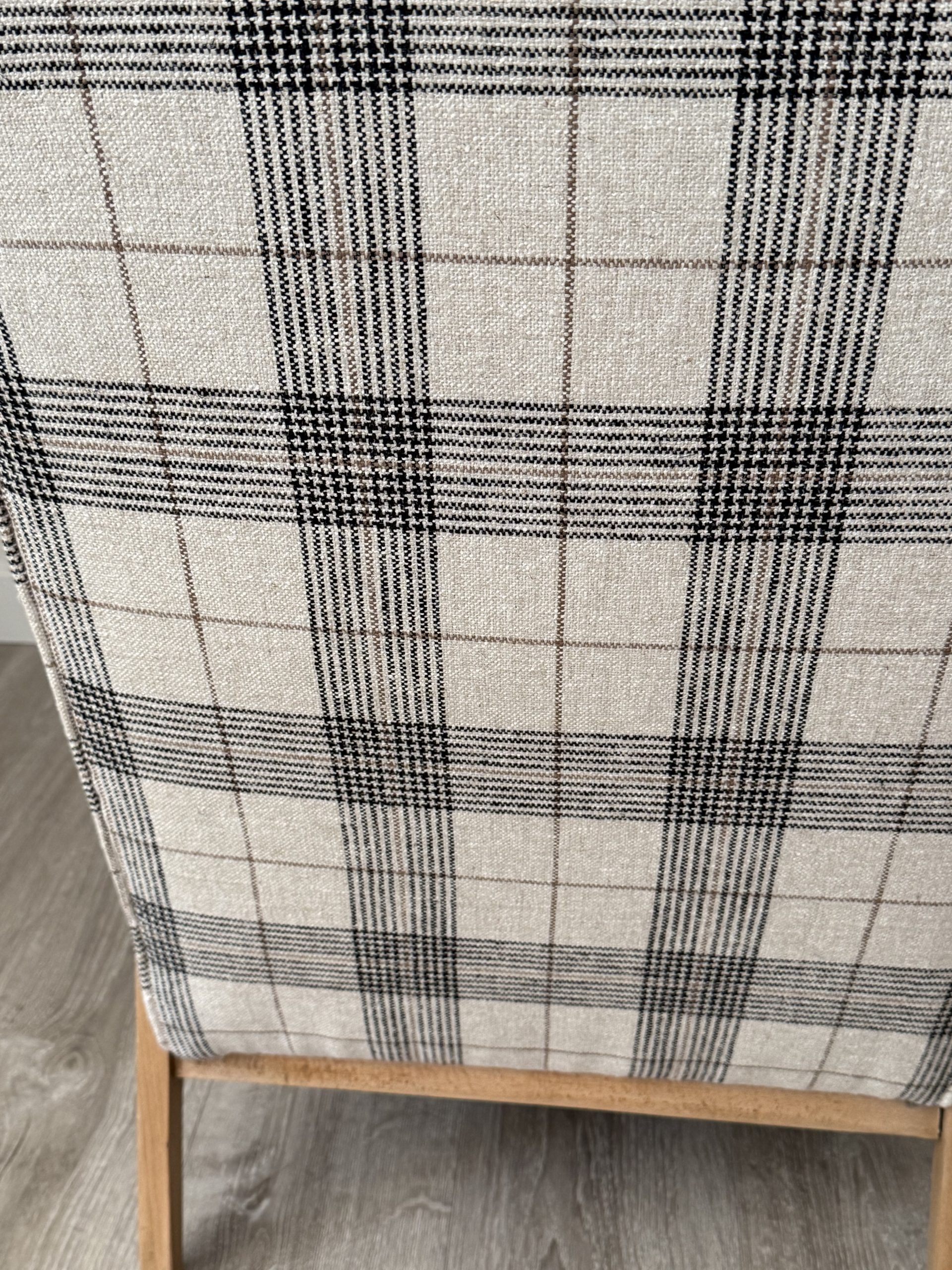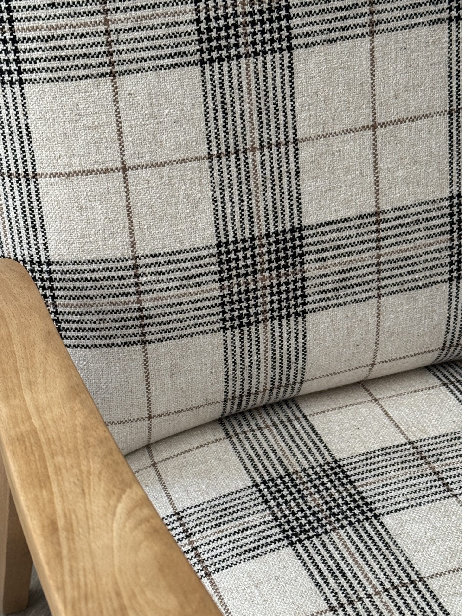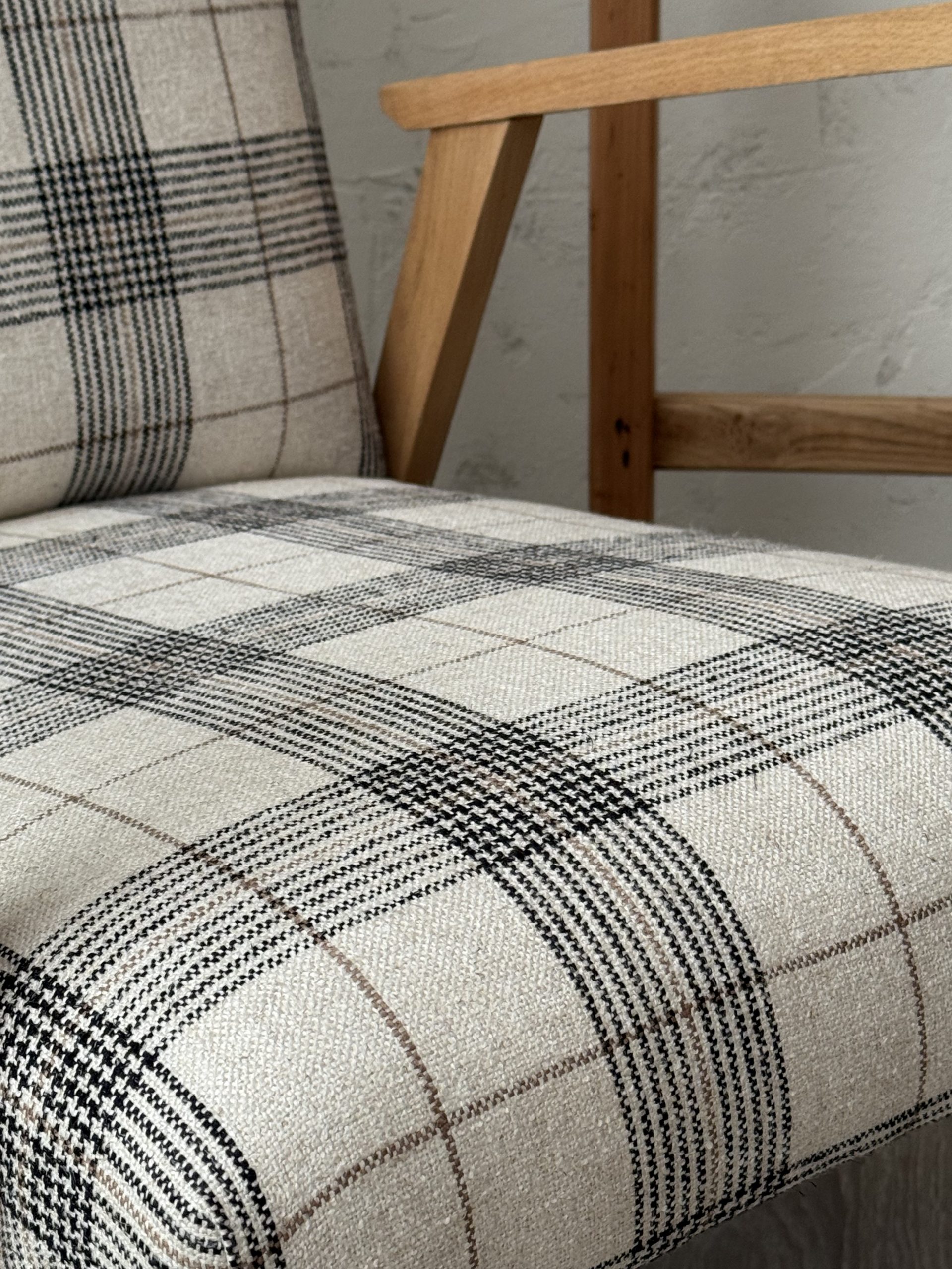 La madera natural luce con su autenticidad del paso del tiempo y el estampado elegido es un tartán que siempre combina bien en cualquier decoración.