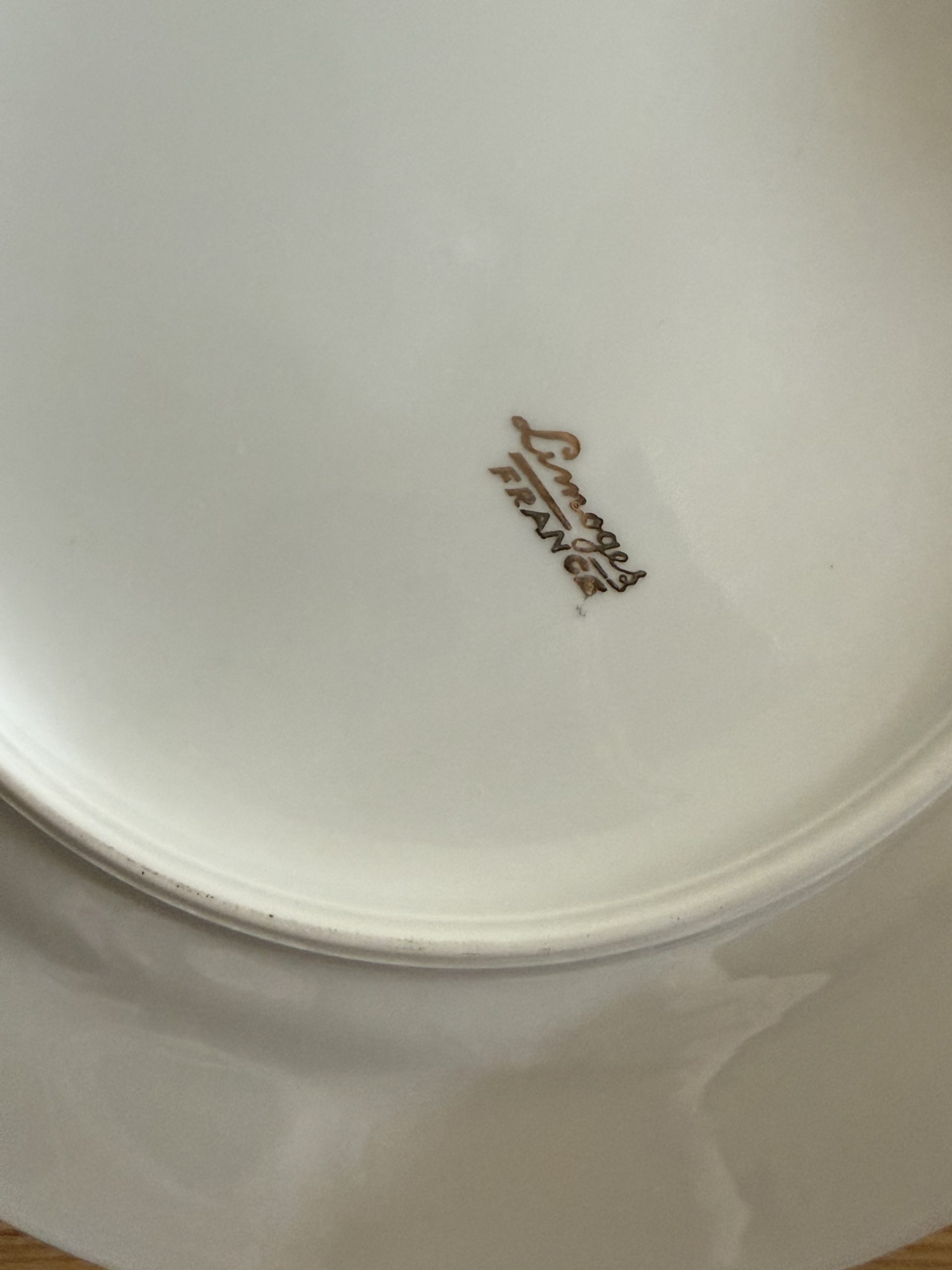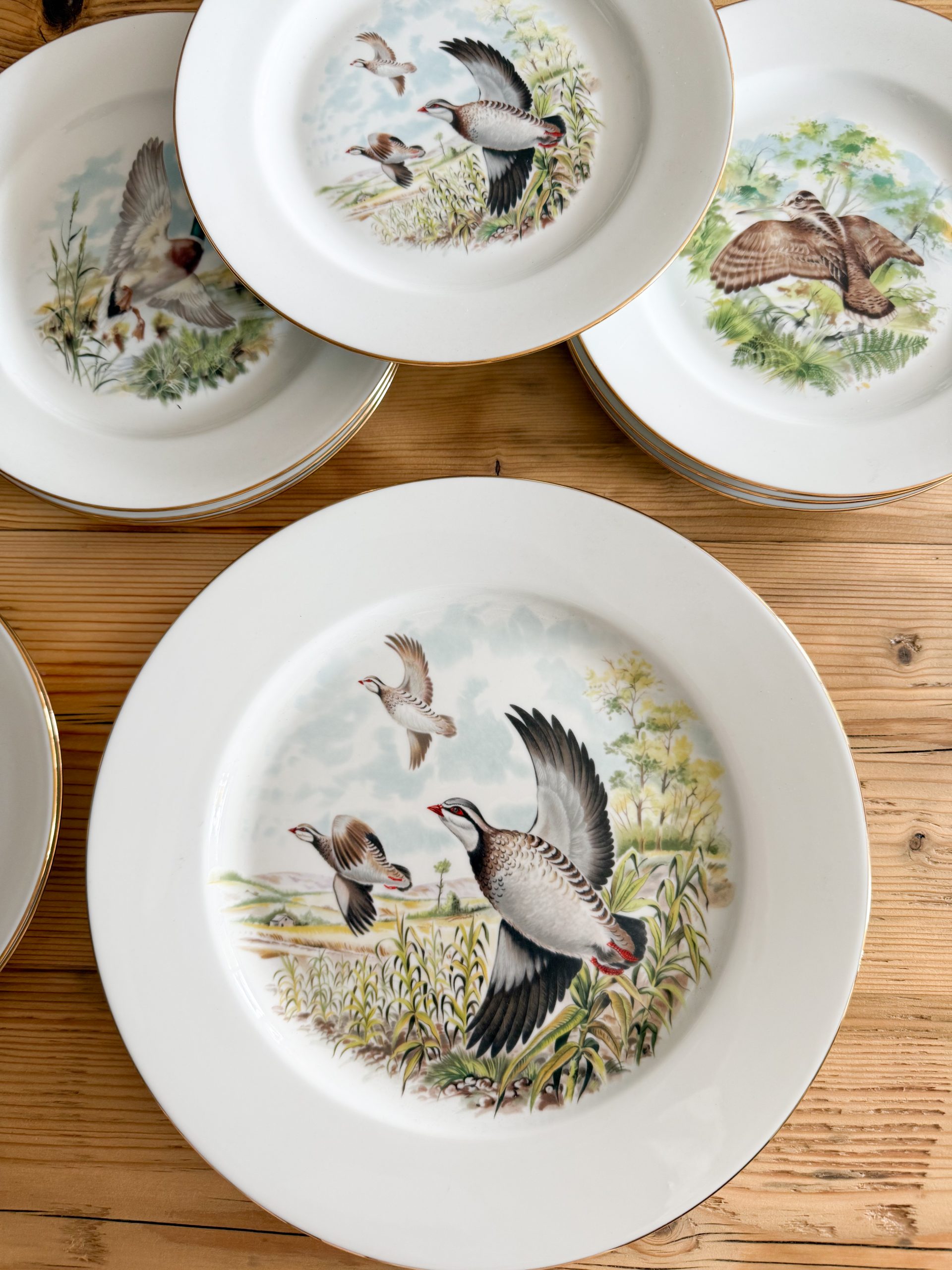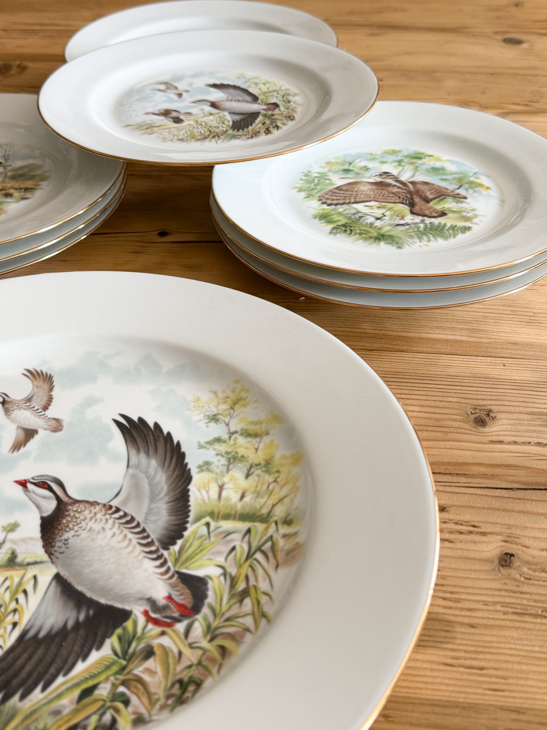 Son platos y fuente con distintos motivos de caza variados y filo dorado.
