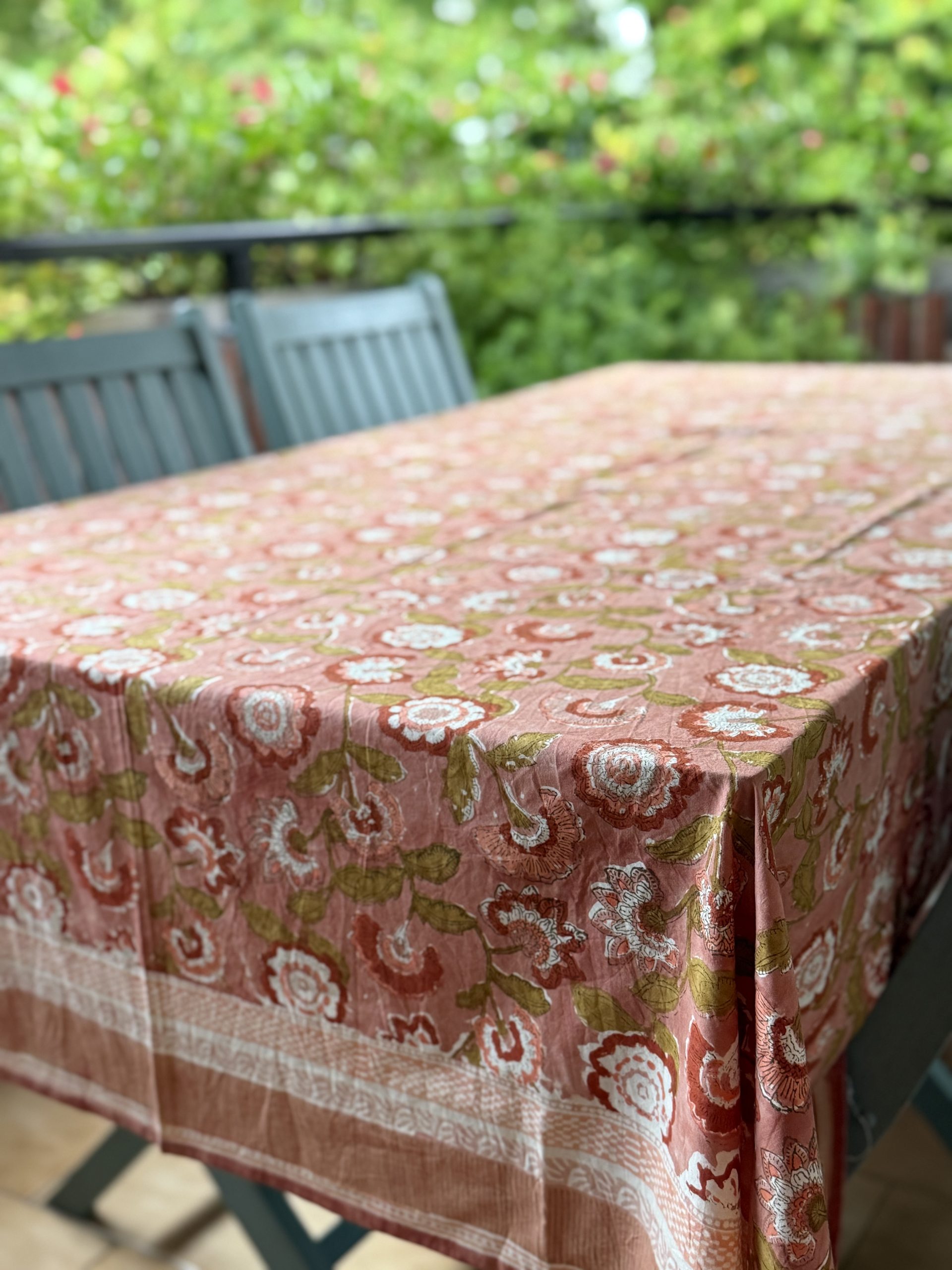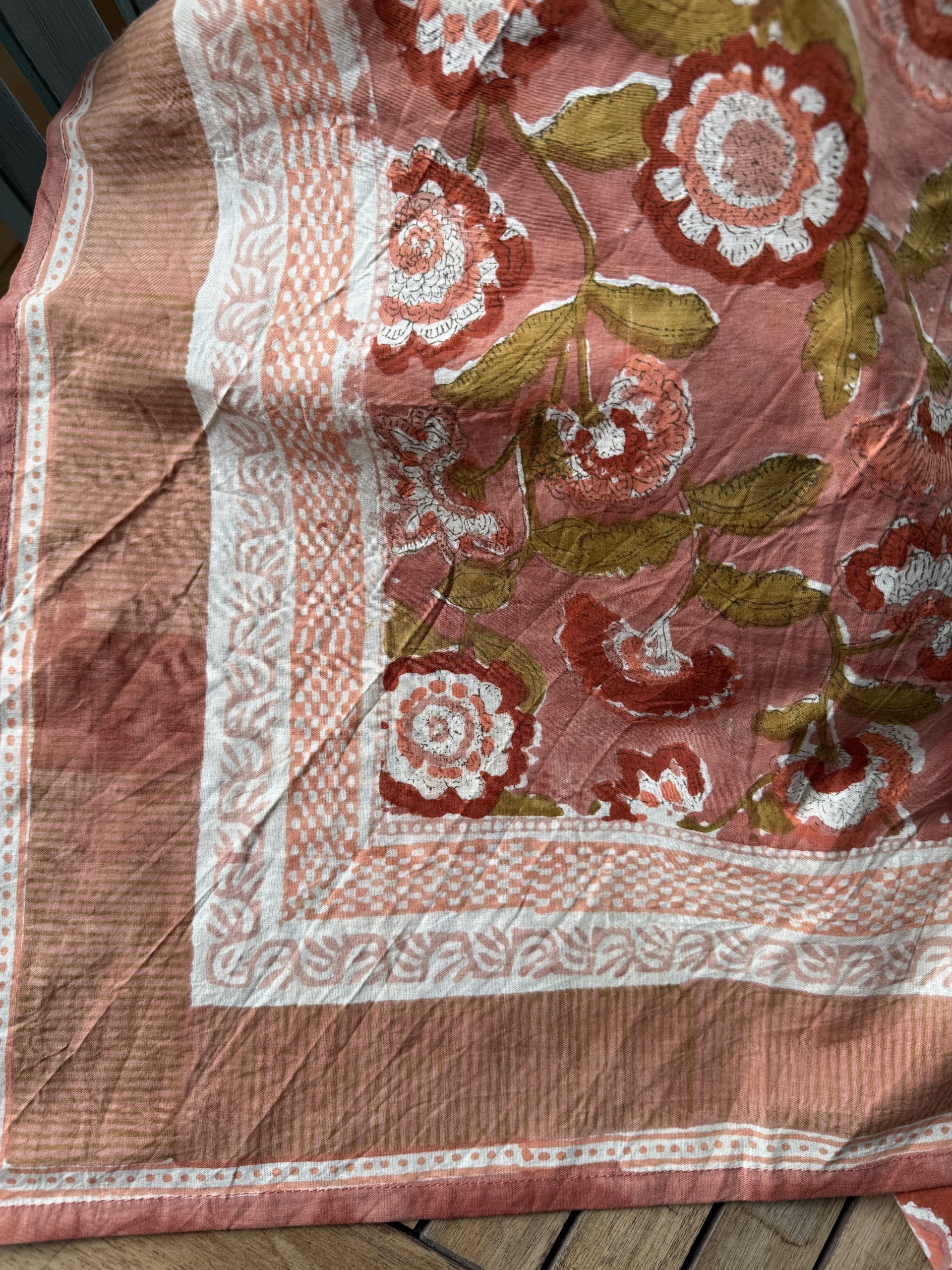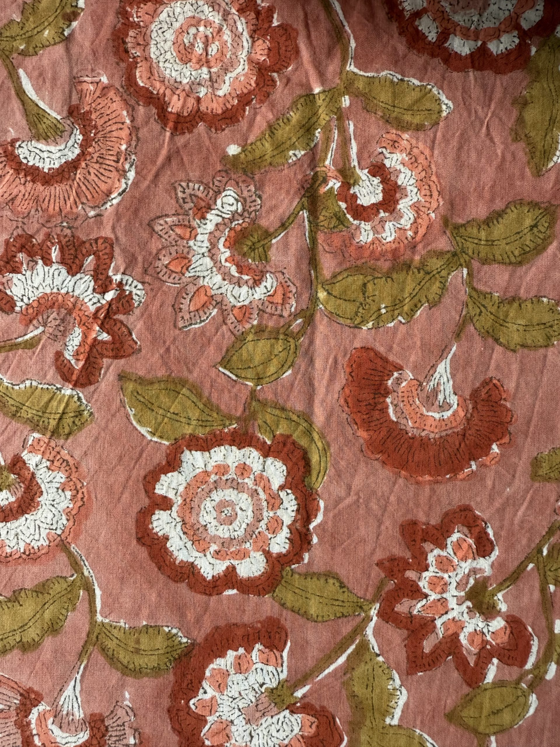 Estampado de flores en tonos rosa con la técnica “Block Print” en India.