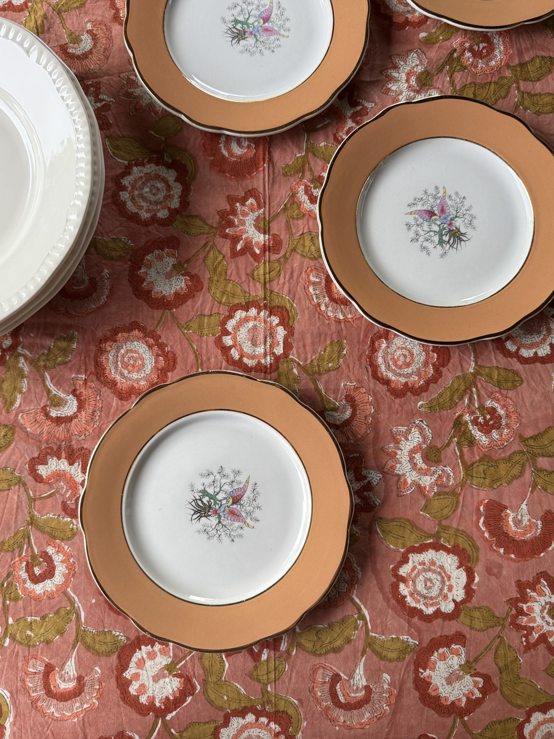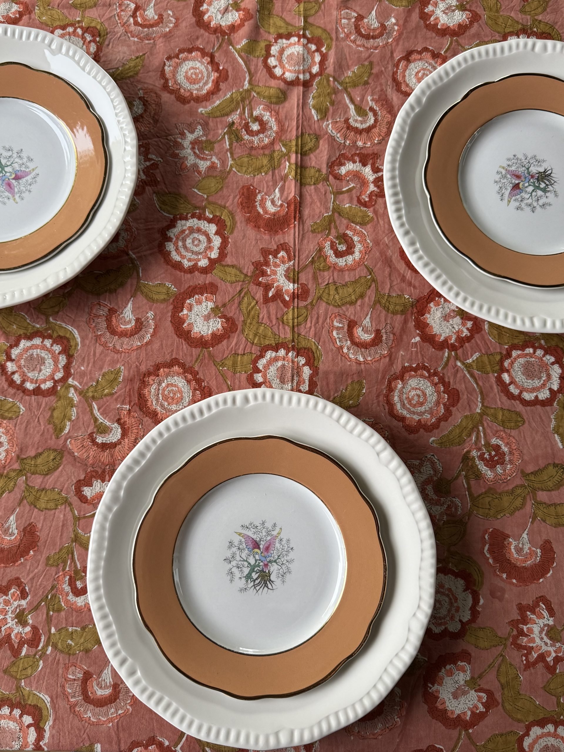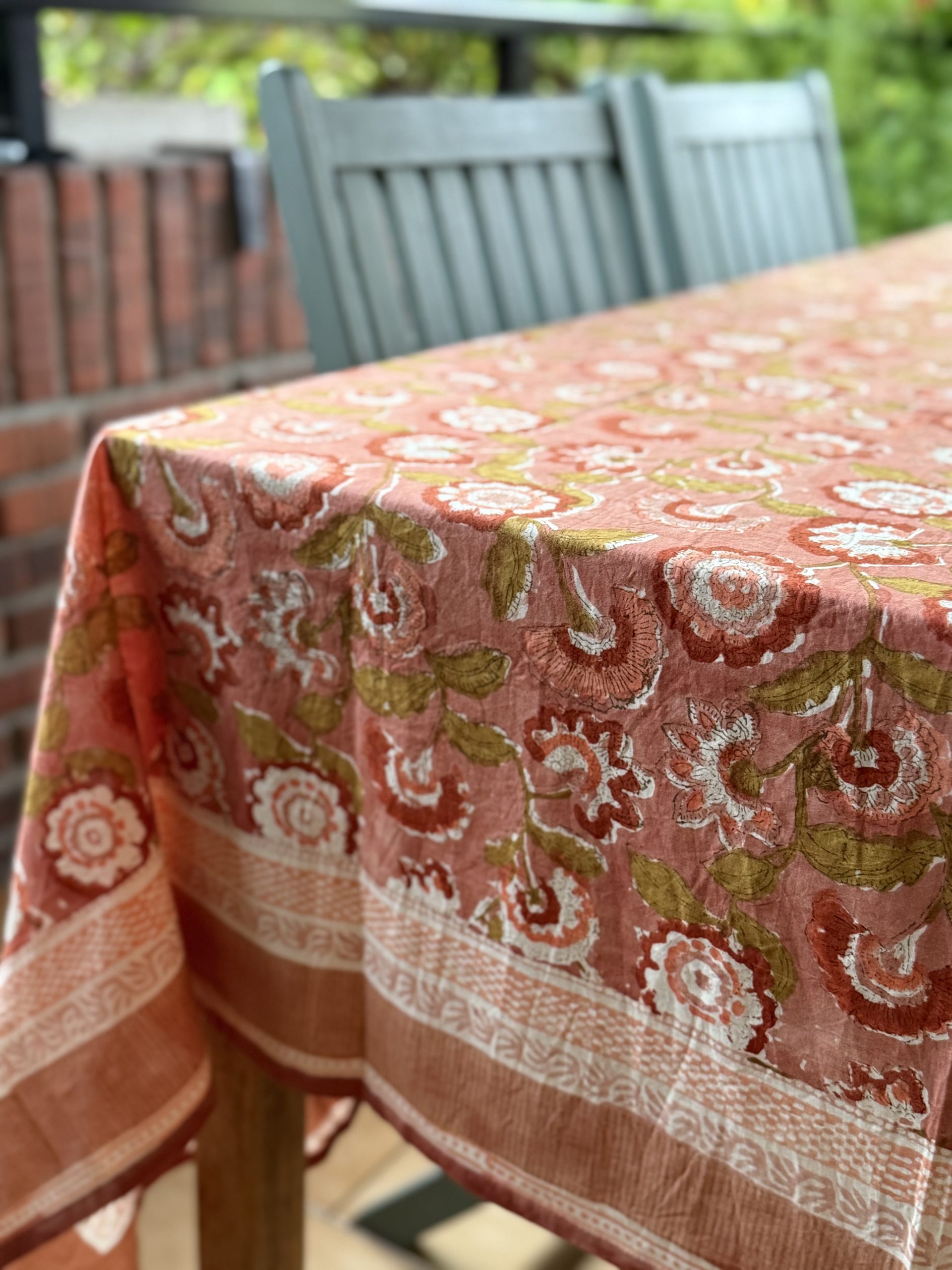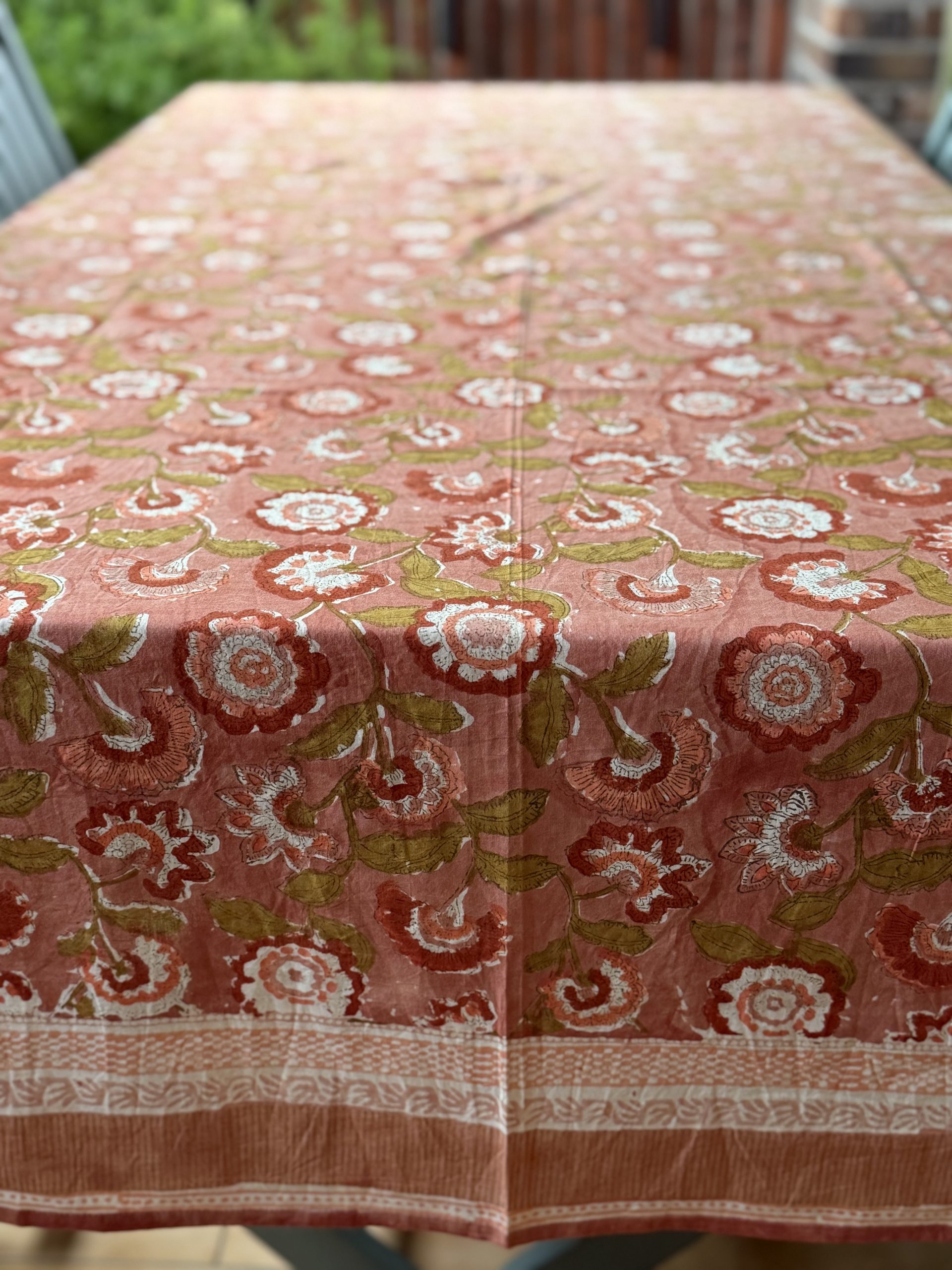 Estampado de flores en tonos rosa con la técnica “Block Print” en India.