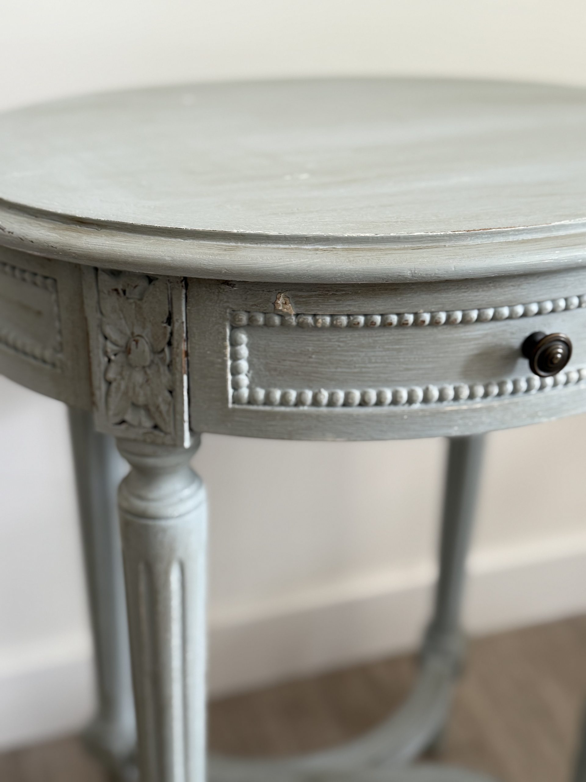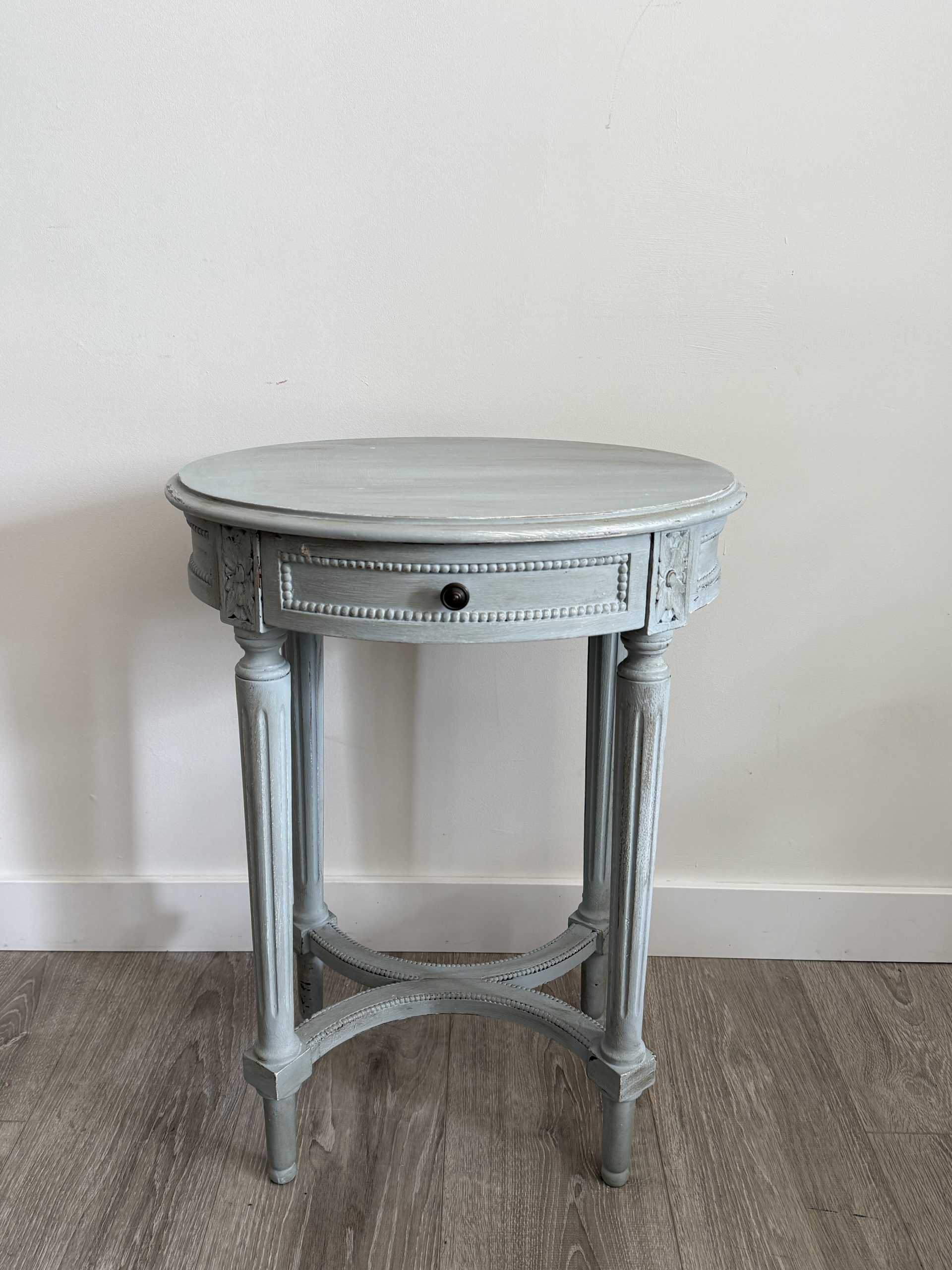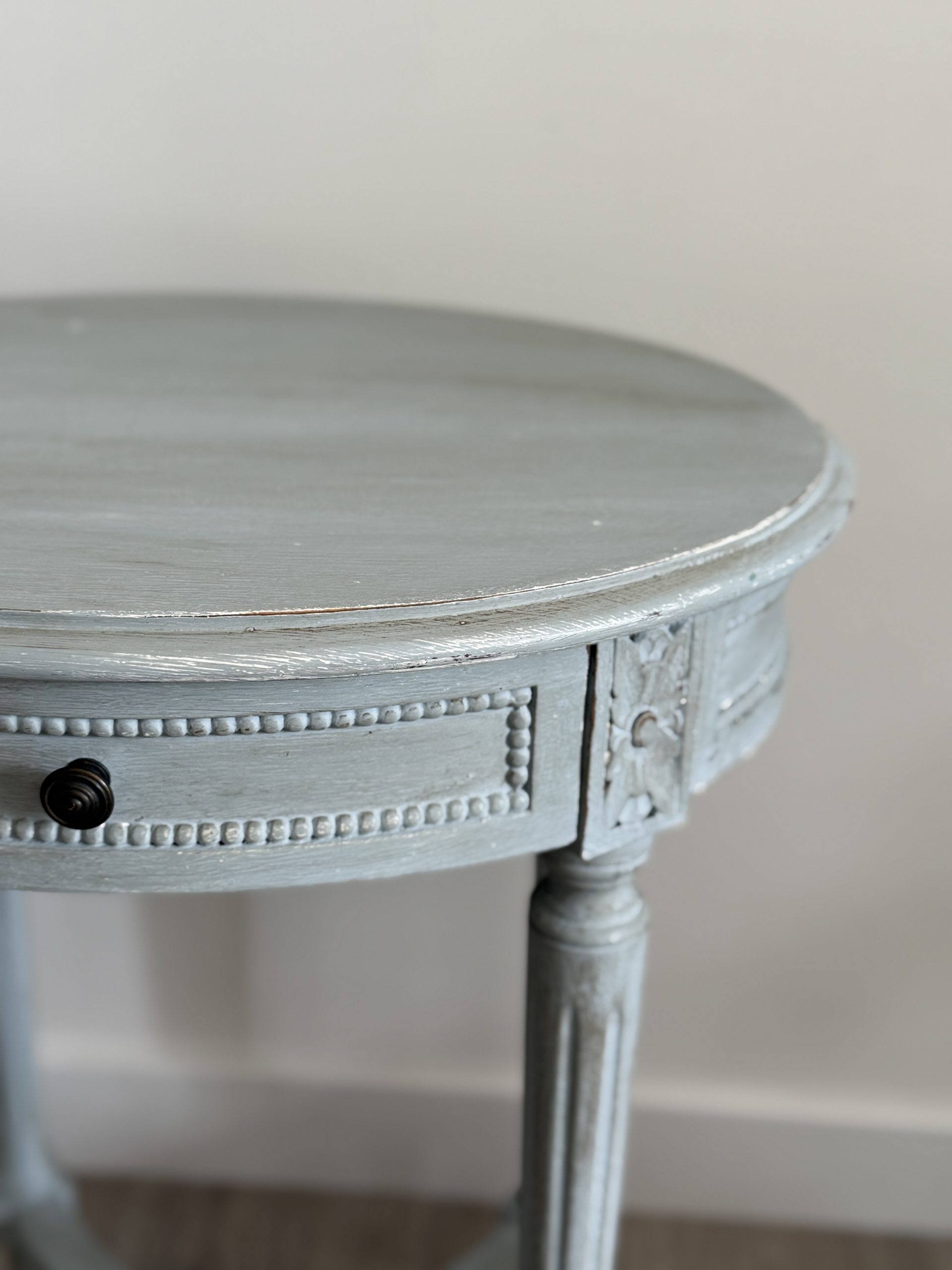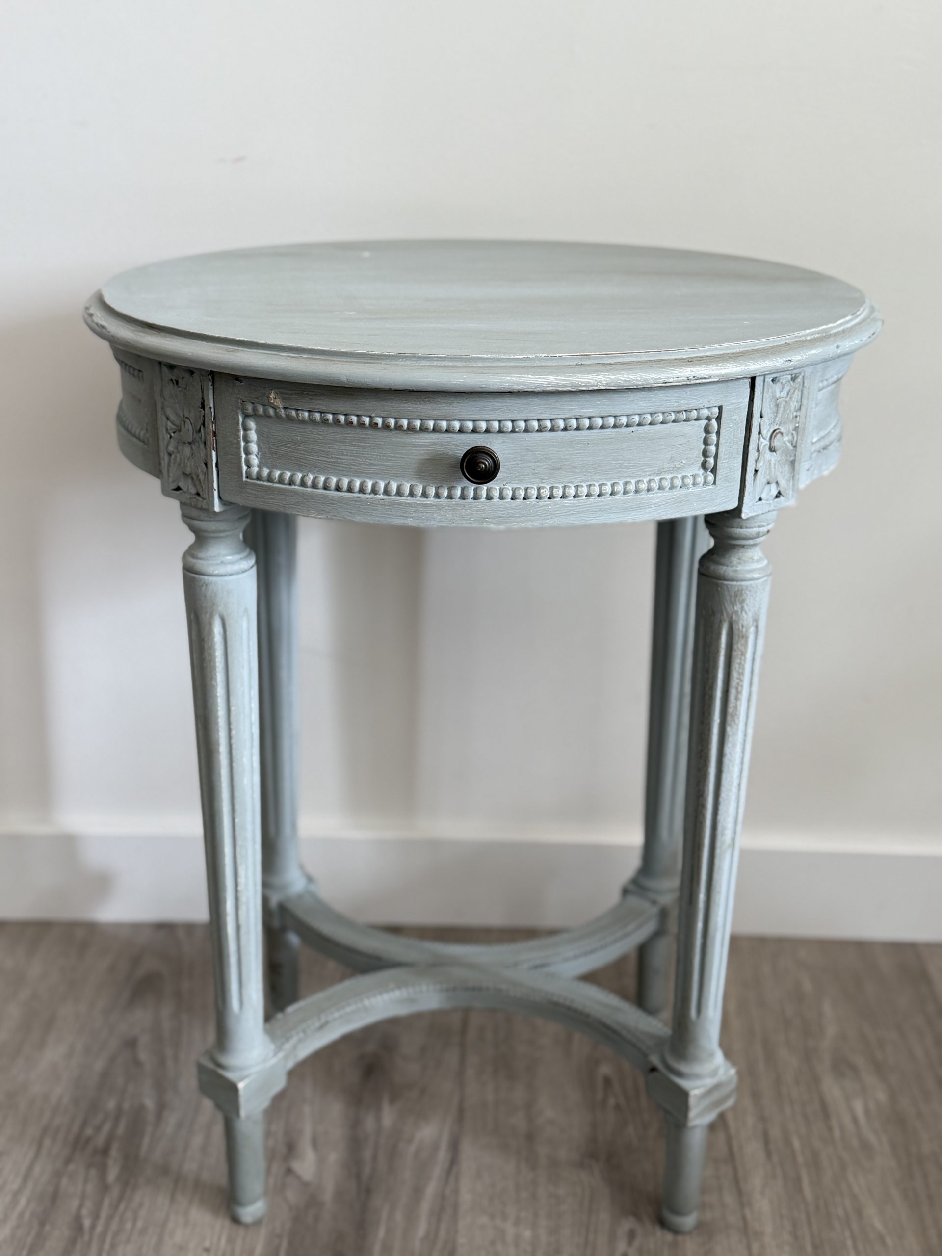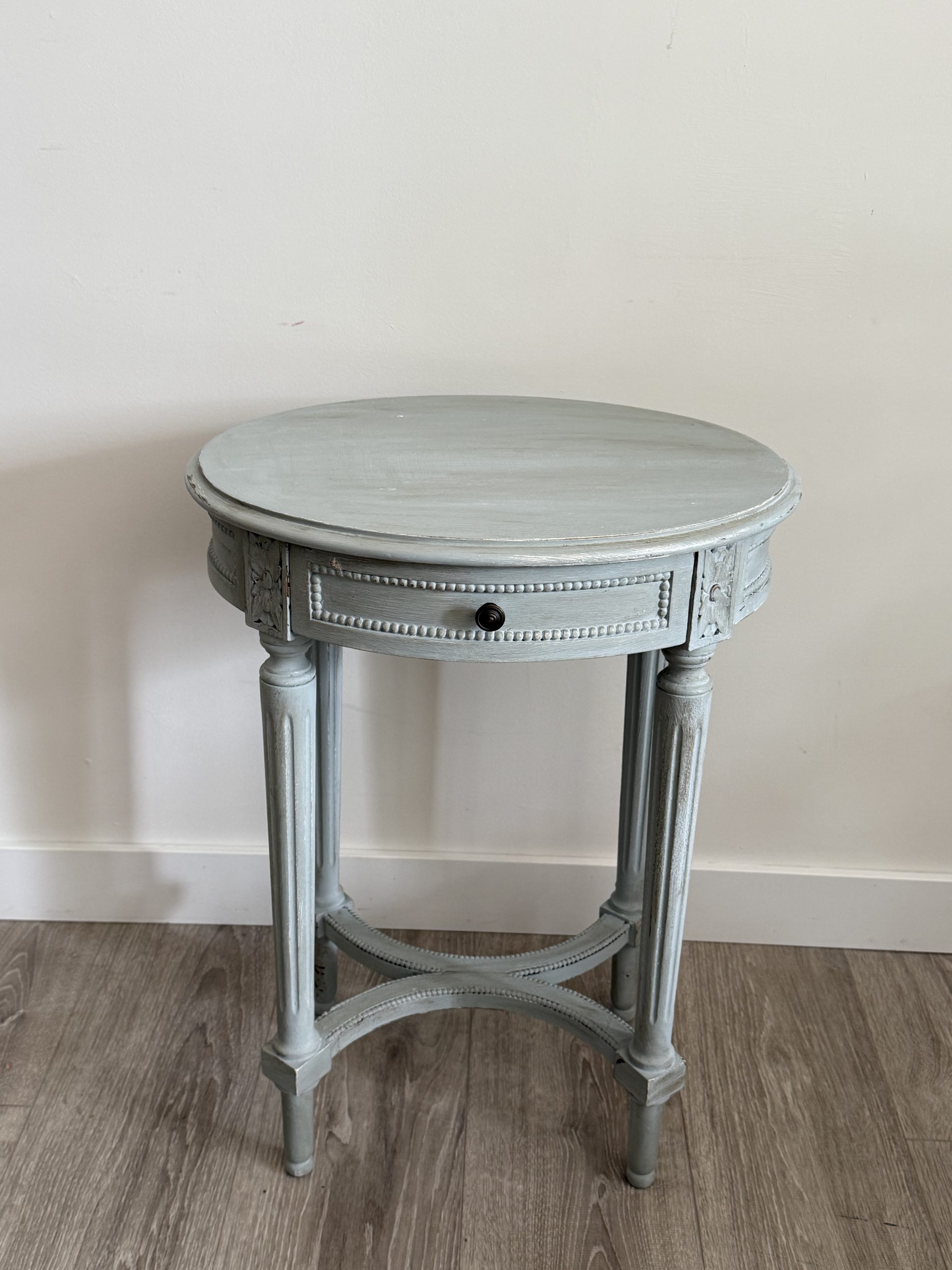 Patinada en azul envejecido, se trata de una pieza con mucho encanto.