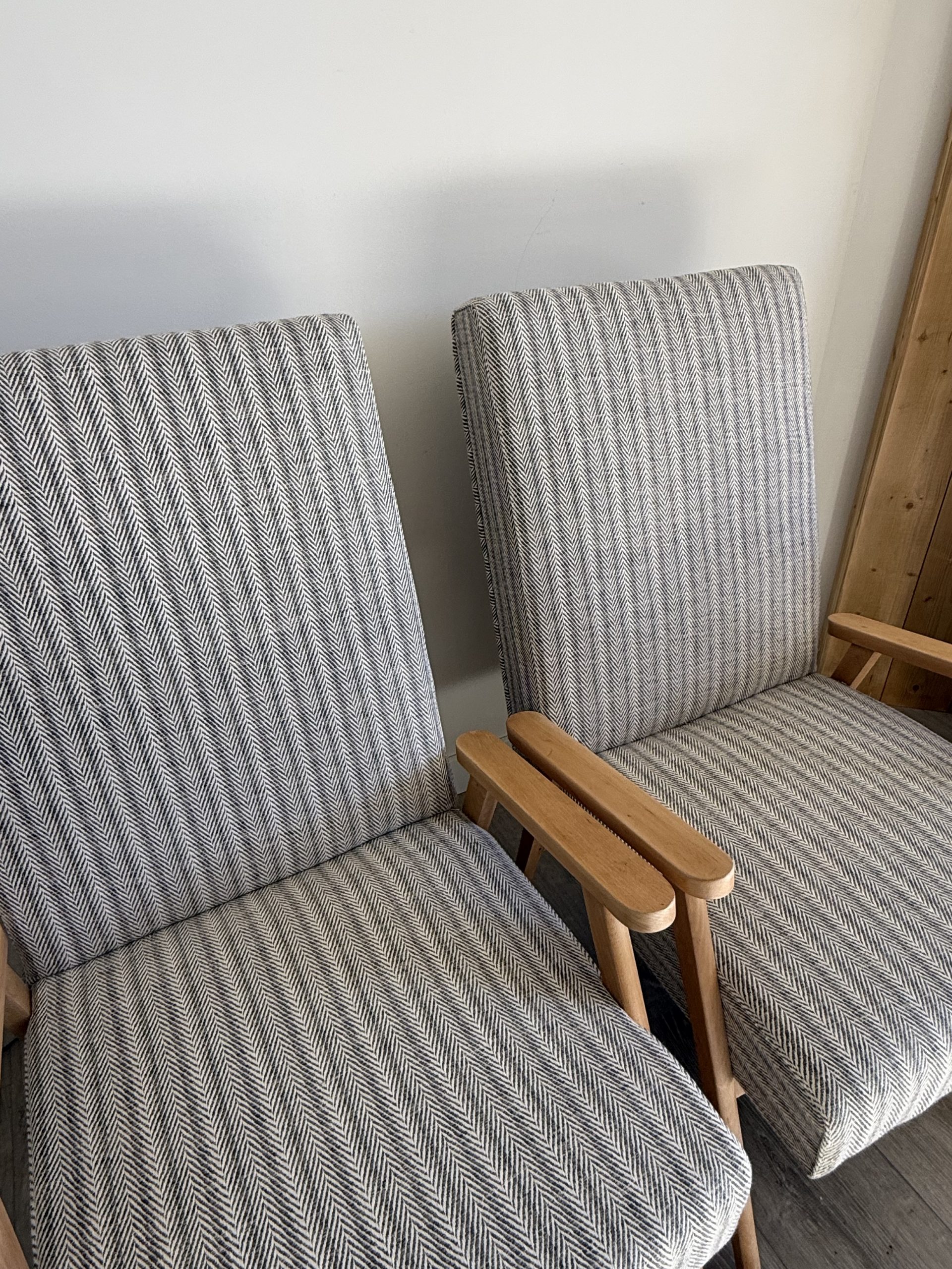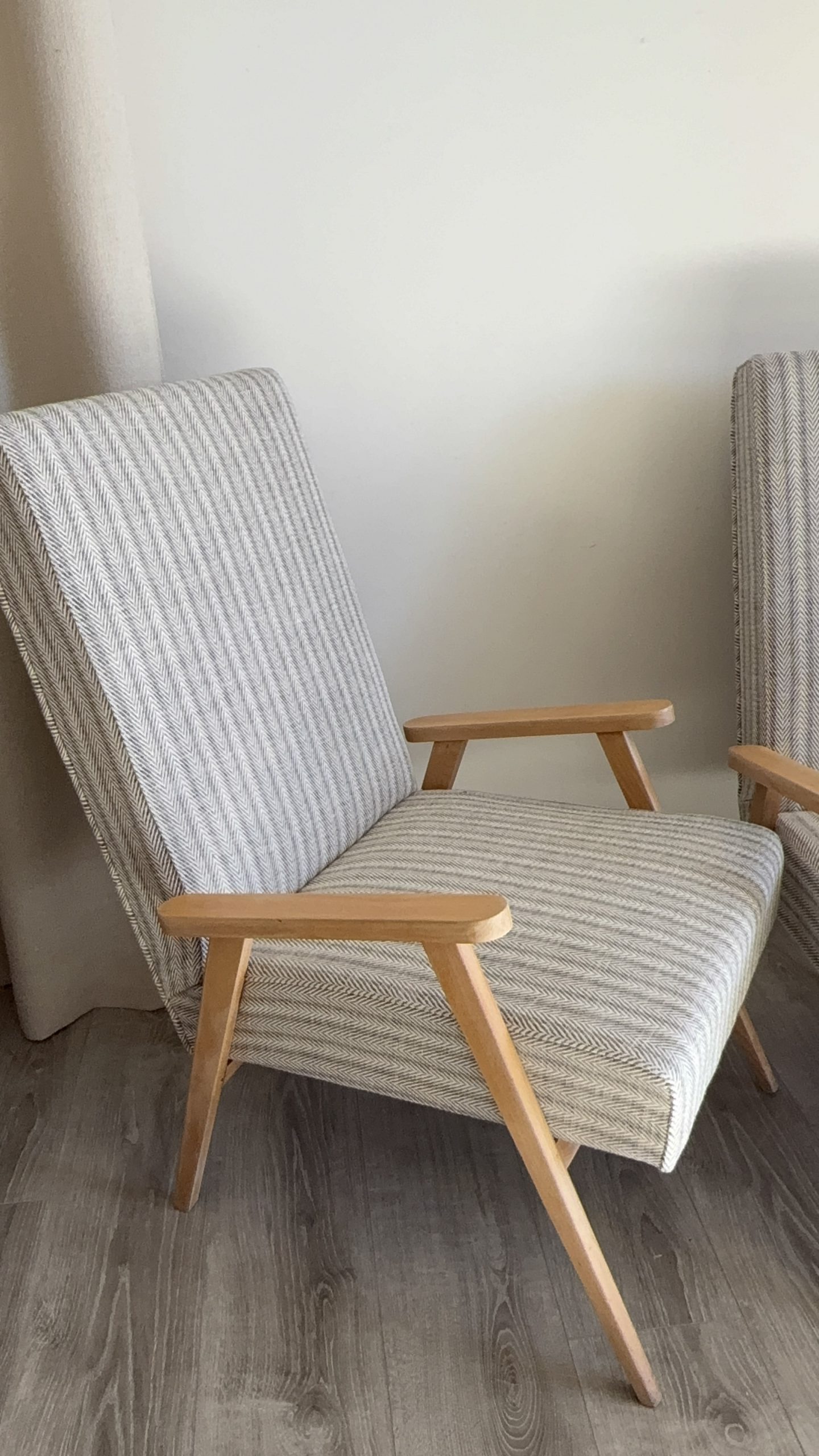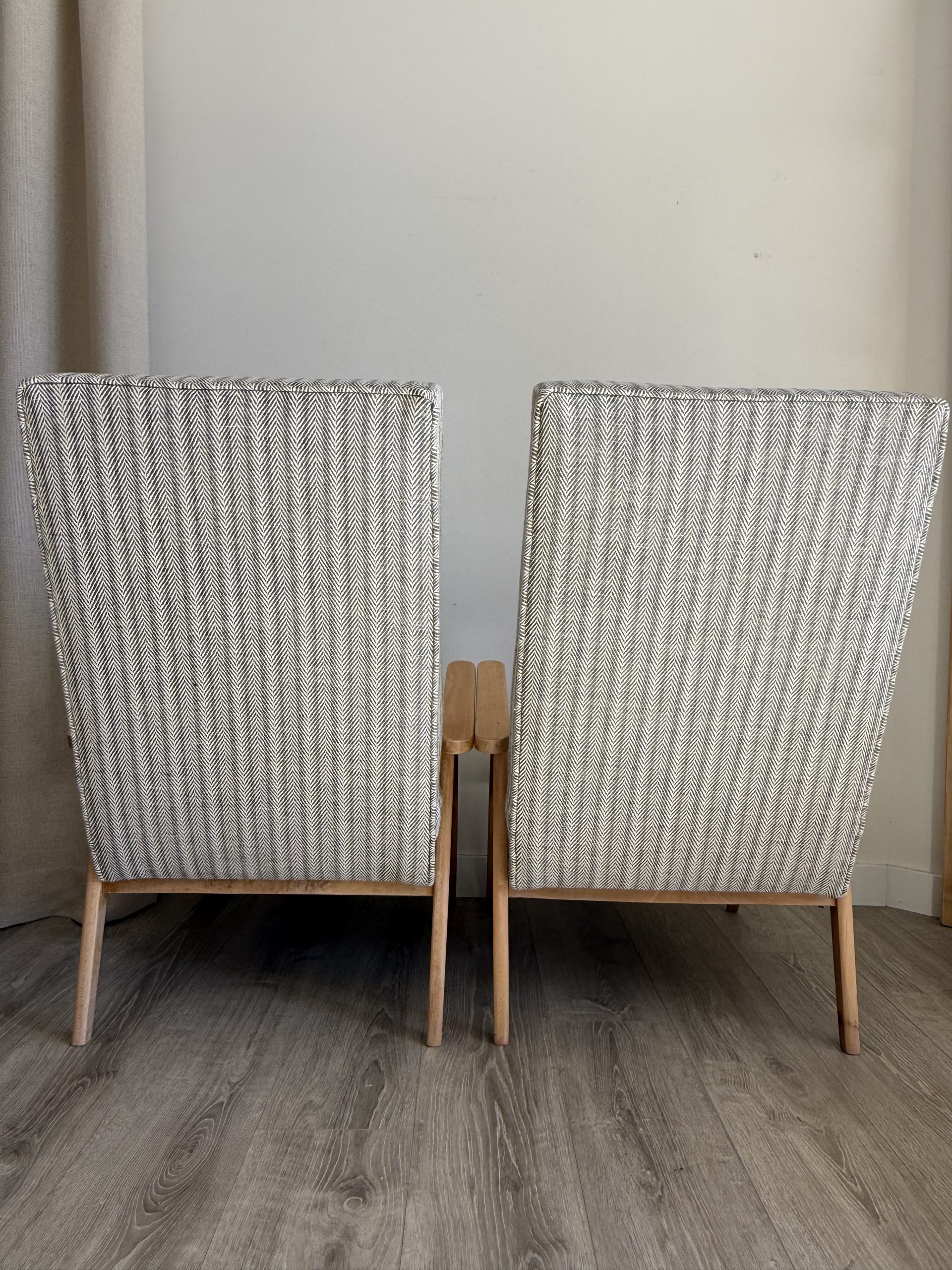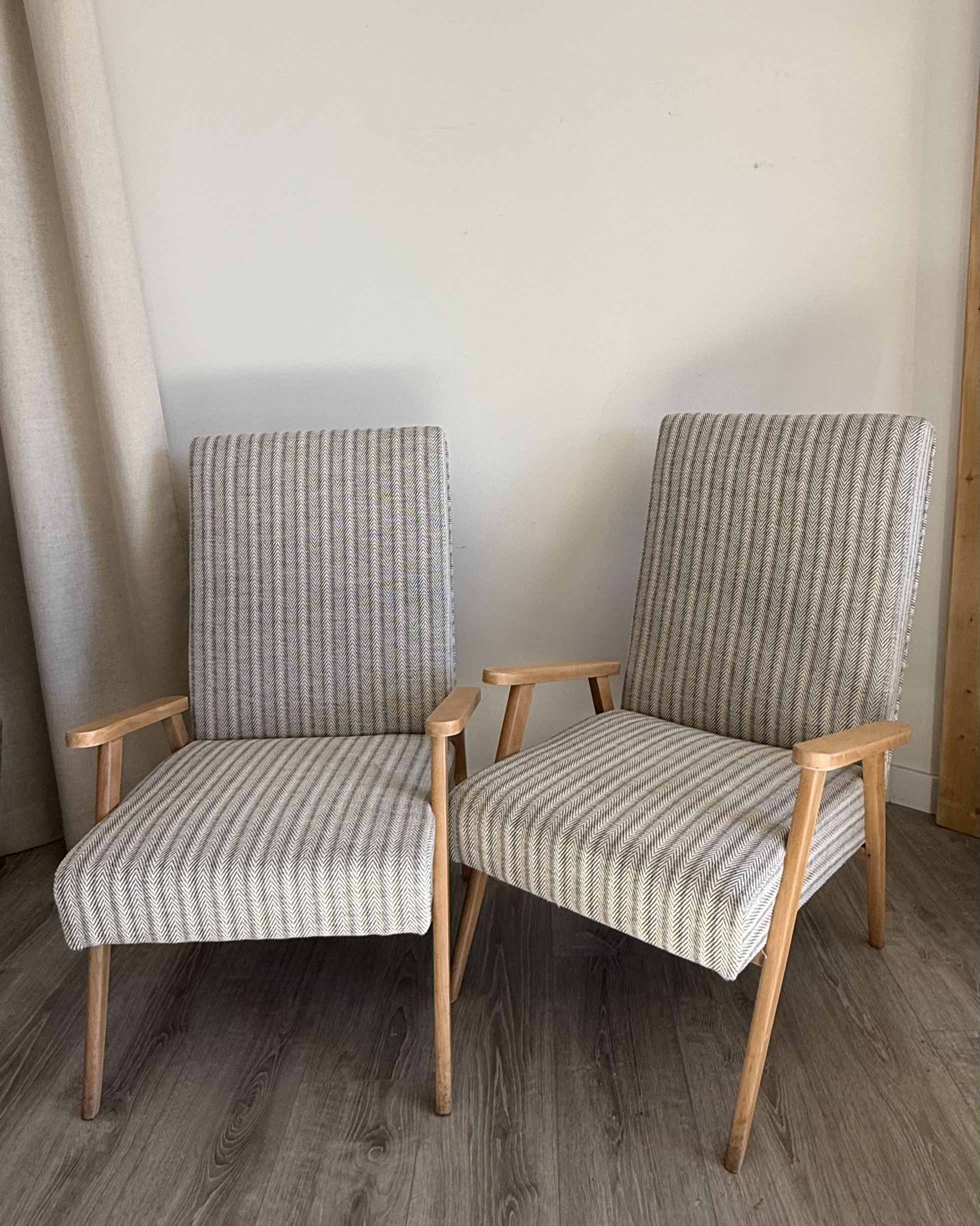 Han sido restauradas en nuestro taller y recién tapizadas con tejido de espiga actual que resulta ser una tonalidad neutra y fácil de integrar en tu Deco.